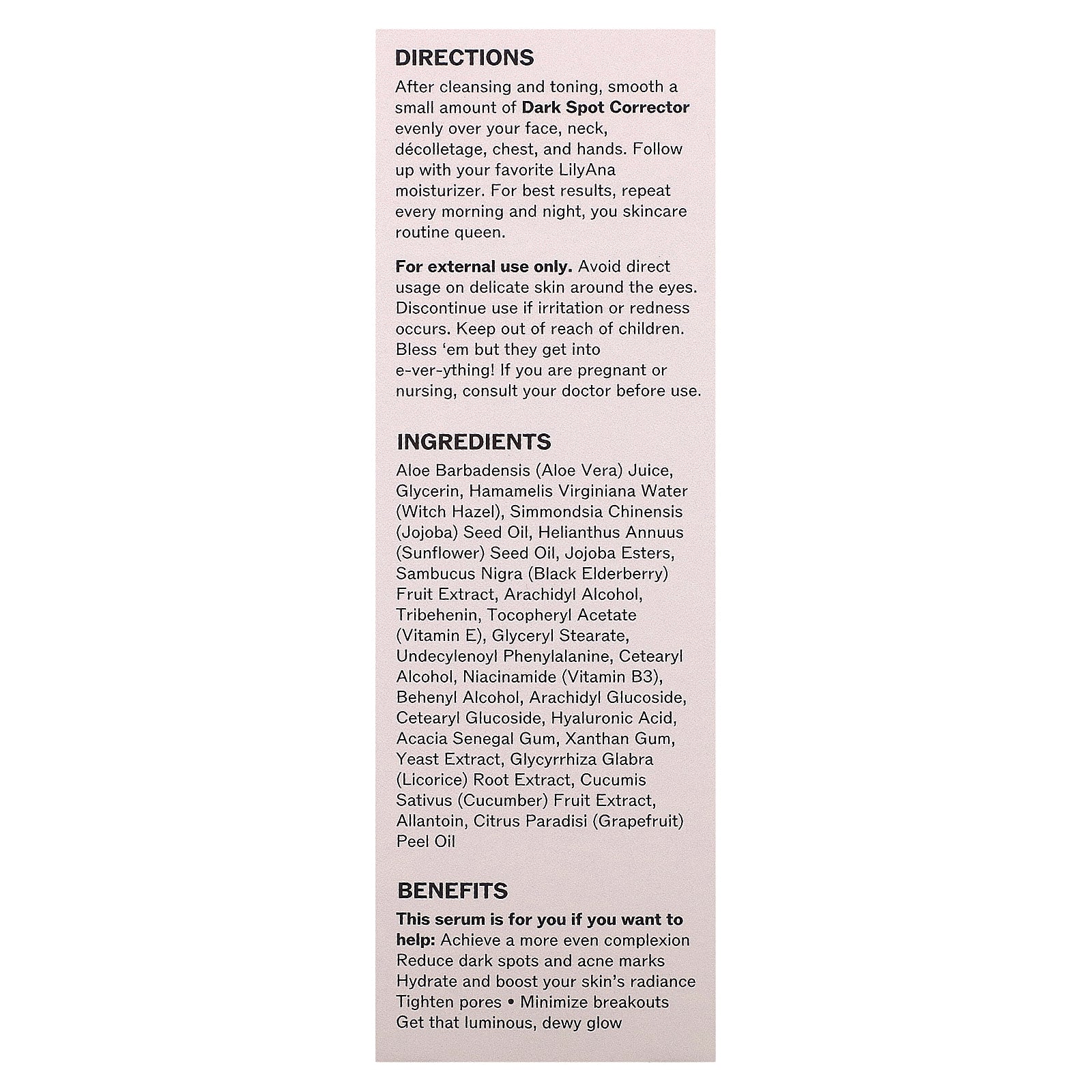 After cleansing and toning, smooth a small amount of Dark Spot Corrector evenly over your face, neck, décolletage, chest, and hands. Follow up with your favorite LilyAna moisturizer. For best results, repeat every morning and night, you skincare routine queen.