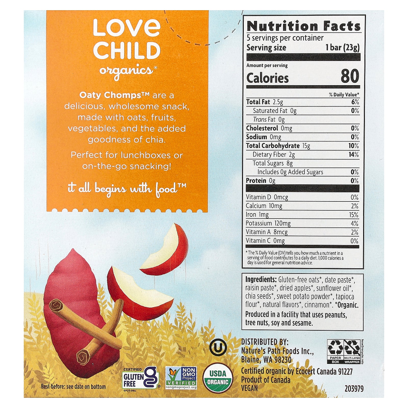 Gluten-free oats*, date paste*, raisin paste*, dried apples*, sunflower oil*, chia seeds*, sweet potato powder*, tapioca flour*, natural flavors*, cinnamon*.
