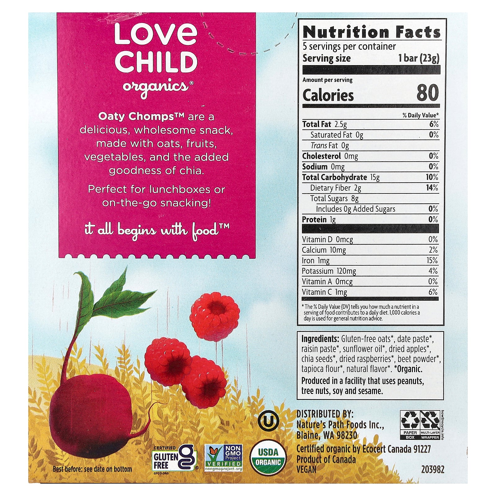 Gluten-free oats*, date paste*, raisin paste*, sunflower oil*, dried apples*, chia seeds*, dried raspberries*, beet powder*, tapioca flour*, natural flavor*.