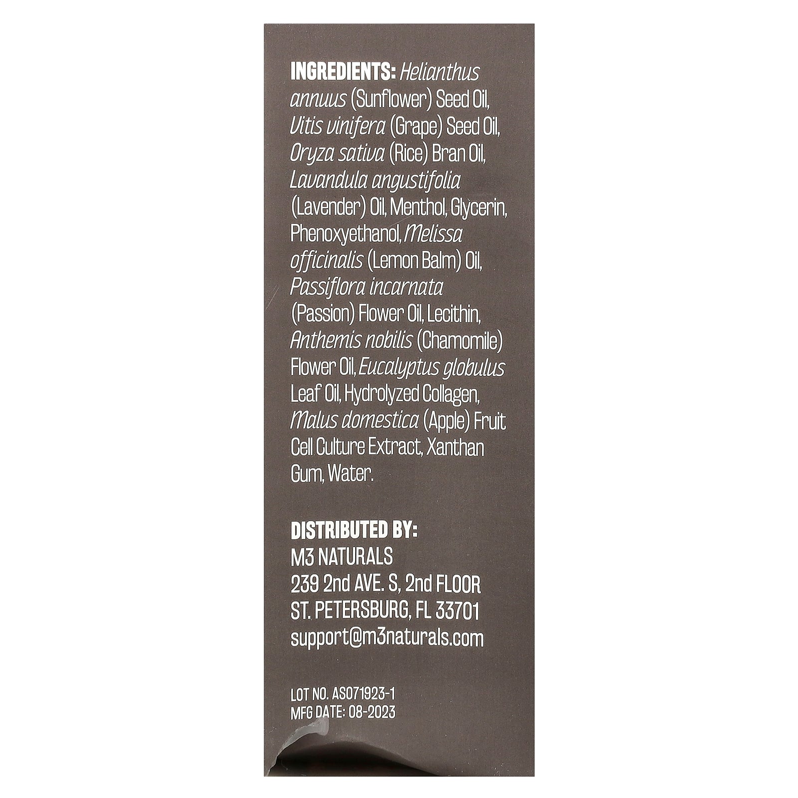 Helianthus annuus (sunflower) seed oil, vitis vinifera (grape) seed oil, oryza sativa (rice) bran oil, lavandula angustifolia (lavender) oil, menthol, glycerin, phenoxyethanol, melissa officinalis (lemon balm) oil, passiflora incarnata passion flower oil, lecithin, anthemis nobilis (chamomile) flower oil, eucalyptus globulus leaf oil, hydrolyzed collagen, malus domestica (apple) fruit cell culture extract, xanthan gum, water.