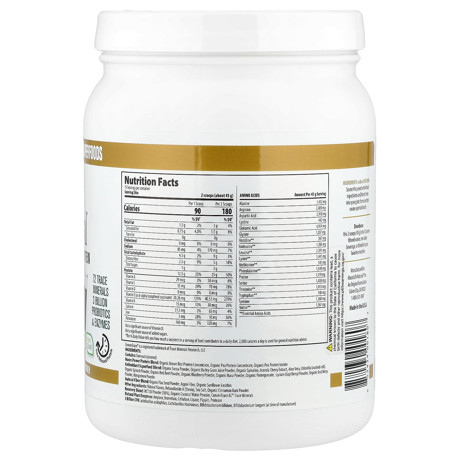 Antioxidant Superfood Blend: Organic cocoa powder, organic barley grass juice powder, organic spirulina, acerola cherry extract, aloe vera, chlorella (cracked cell), organic spinach powder, organic red beet powder, organic blueberry powder, organic maca powder, organic pomegranate, lycium (goji berry) powder, organic acai berry powder, mangosteen powder.