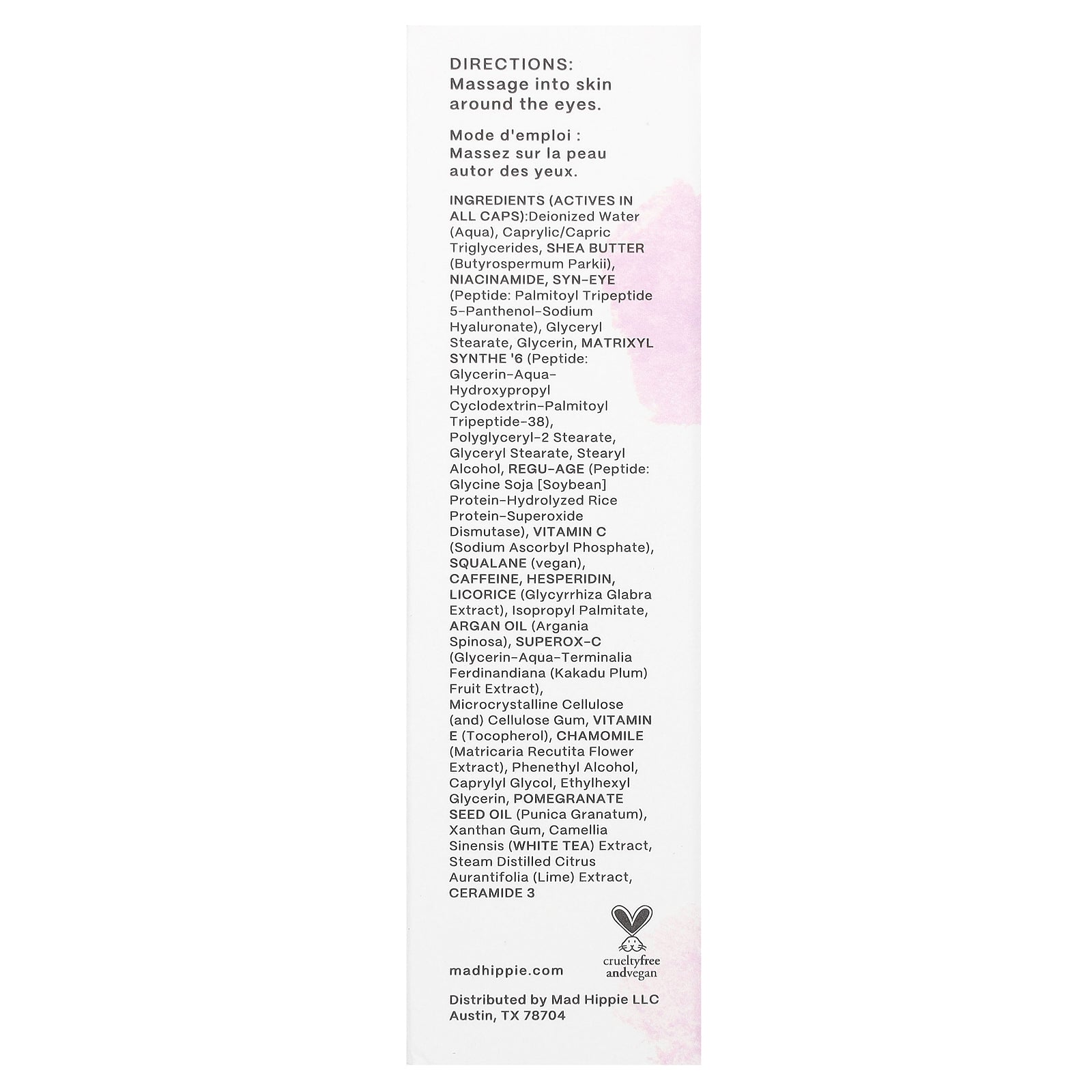 Deionized water (aqua), caprylic/capric triglycerides, shea butter (butyrospermum parkii), niacinamide, syn-eye (peptide: palmitoyl tripeptide 5-panthenol-sodium hyaluronate), glyceryl stearate, glycerin, matrixyl synthe '6 (peptide: glycerin-aqua- hydroxypropyl cyclodextrin-palmitoyl tripeptide-38), polyglyceryl-2 stearate, glyceryl stearate, stearyl alcohol, regu-age (peptide: glycine soja [soybean] protein-hydrolyzed rice protein-superoxide dismutase), vitamin c (sodium ascorbyl phosphate), squalane (vegan), caffeine, hesperidin, licorice (glycyrrhiza glabra extract), isopropyl palmitate, argan oil (argania spinosa), superox-c (glycerin-aqua-terminalia ferdinandiana (kakadu plum) fruit extract), microcrystalline cellulose (and) cellulose gum, vitamin e (tocopherol), chamomile (matricaria recutita flower extract), phenethyl alcohol, caprylyl glycol, ethylhexyl glycerin, pomegranate seed oil (punica granatum), xanthan gum, camellia sinensis (white tea) extract, steam distilled citrus aurantifolia (lime) extract, ceramide 3.