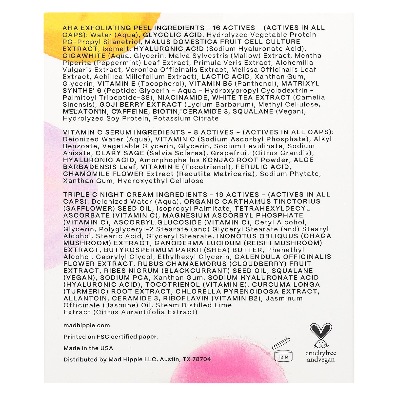 Triple C Night Cream - 19 Actives: (Actives in bold) Water, organic carthamus tinctorius (safflower) seed oil, isopropyl palmitate, tetrahexyldecyl ascorbate (vitamin C), magnesium ascorbyl phosphate (vitamin C), ascorbyl glucoside (vitamin C), cetyl alcohol, glycerin, polyglyceryl-2 stearate (and) glyceryl stearate (and) stearyl alcohol, stearic acid, glyceryl stearate, inonotus obliquus (chaga mushroom) extract, ganoderma lucidum (reishi mushroom) extract, butyrospermum parkii (shea) butter, phenethyl alcohol, caprylyl glycol, ethylhexyl glycerin, calendula officinalis flower extract, rubus chamaemorus (cloudberry) fruit extract, ribes nigrum (blackcurrant) seed oil, squalane (vegan), sodium pca, xanthan gum, sodium hyaluronate acid (hyaluronic acid), tocotrienol (vitamin E), curcuma longa (turmeric) root extract, chlorella pyrenoidosa extract, allantoin, ceramide 3, riboflavin (vitamin B2), jasminum officinale (jasmine) oil, steam distilled lime extract (citrus aurantifolia extract).