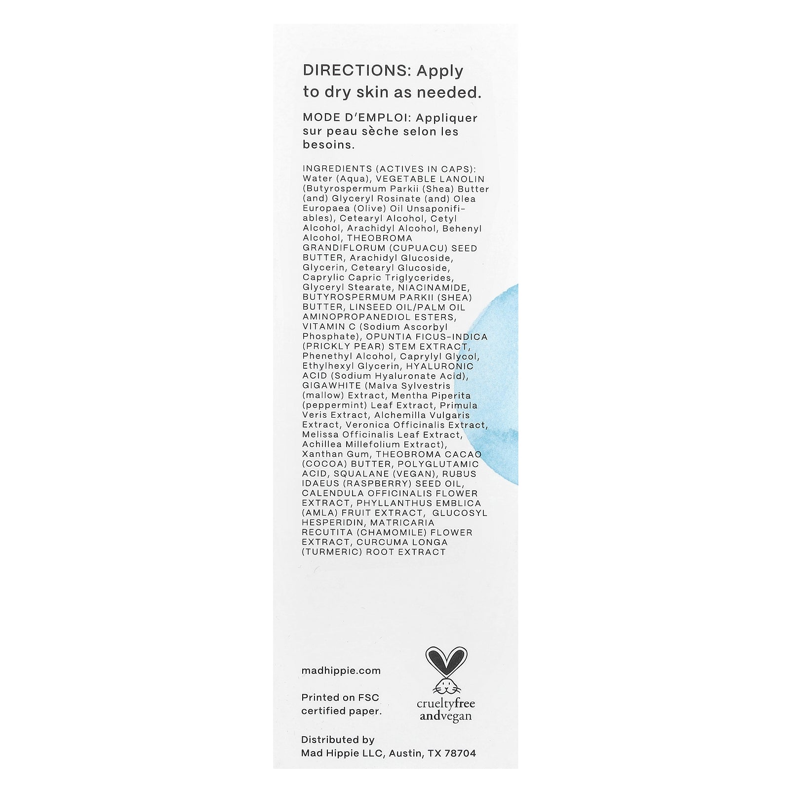 Water (aqua), vegetable lanolin (butyrospermum parkii (shea) butter (and) glyceryl rosinate (and) olea europaea (olive) oil unsaponifi- ables), cetearyl alcohol, cetyl alcohol, arachidyl alcohol, behenyl alcohol, theobroma grandiflorum (cupuacu) seed butter, arachidyl glucoside, glycerin, cetearyl glucoside, caprylic capric triglycerides, glyceryl stearate, niacinamide, butyrospermum parkii (shea) butter, linseed oil/palm oil aminopropanediol esters, vitamin c (sodium ascorbyl phosphate), opuntia ficus-indica (prickly pear) stem extract, phenethyl alcohol, caprylyl glycol, ethylhexyl glycerin, hyaluronic acid (sodium hyaluronate acid), gigawhite (malva sylvestris (mallow) extract, mentha piperita (peppermint) leaf extract, primula veris extract, alchemilla vulgaris extract, veronica officinalis extract, melissa officinalis leaf extract, achillea millefolium extract), xanthan gum, theobroma cacao (cocoa) butter, polyglutamic acid, squalane (vegan), rubus idaeus (raspberry) seed oil, calendula officinalis flower extract, phyllanthus emblica (amla) fruit extract, glucosyl hesperidin, matricaria recutita (chamomile) flower extract, curcuma longa (turmeric) root extract.