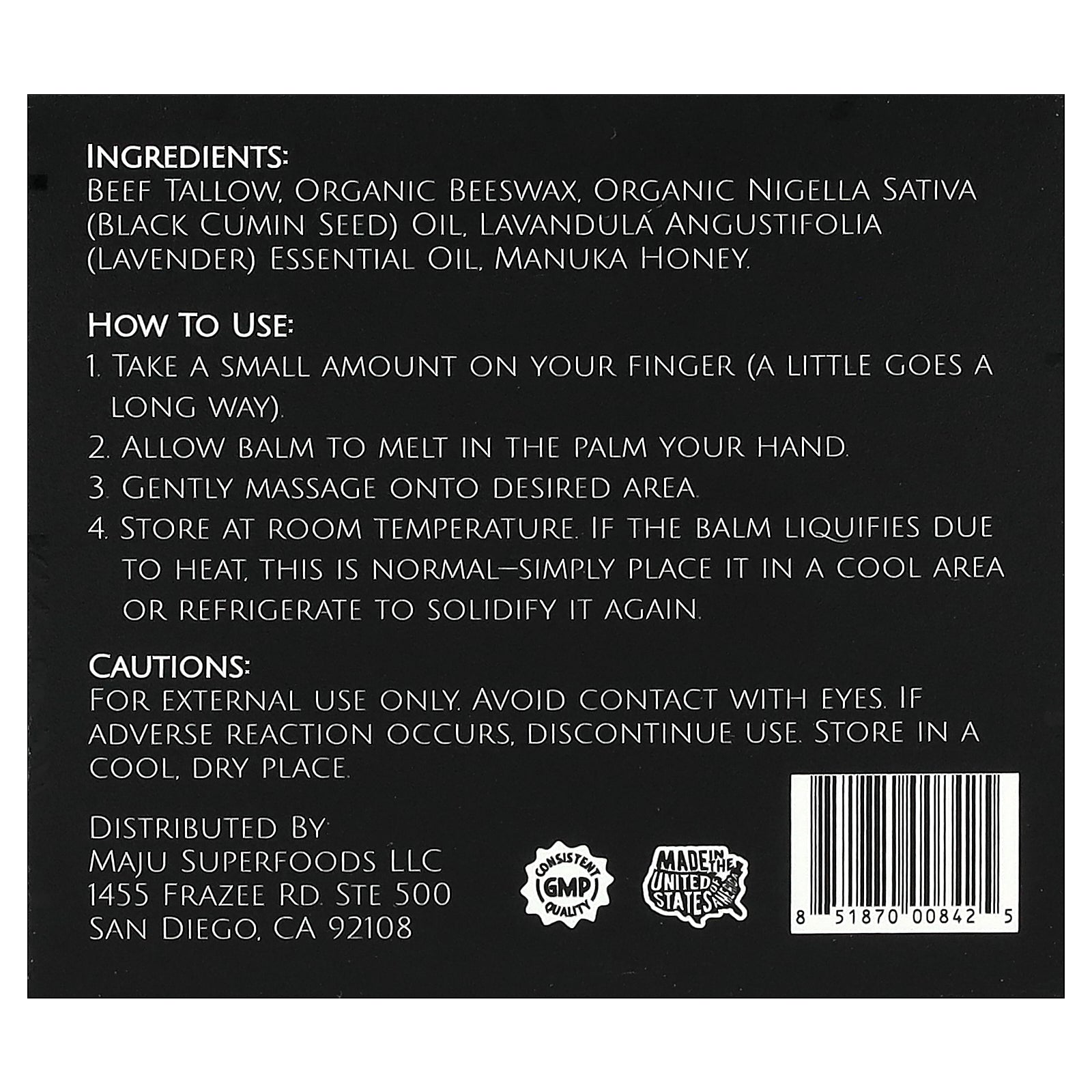 Beef tallow, organic beeswax, organic nigella sativa (black cumin seed) oil, lavandula angustifolia (lavender) essential oil, manuka honey.