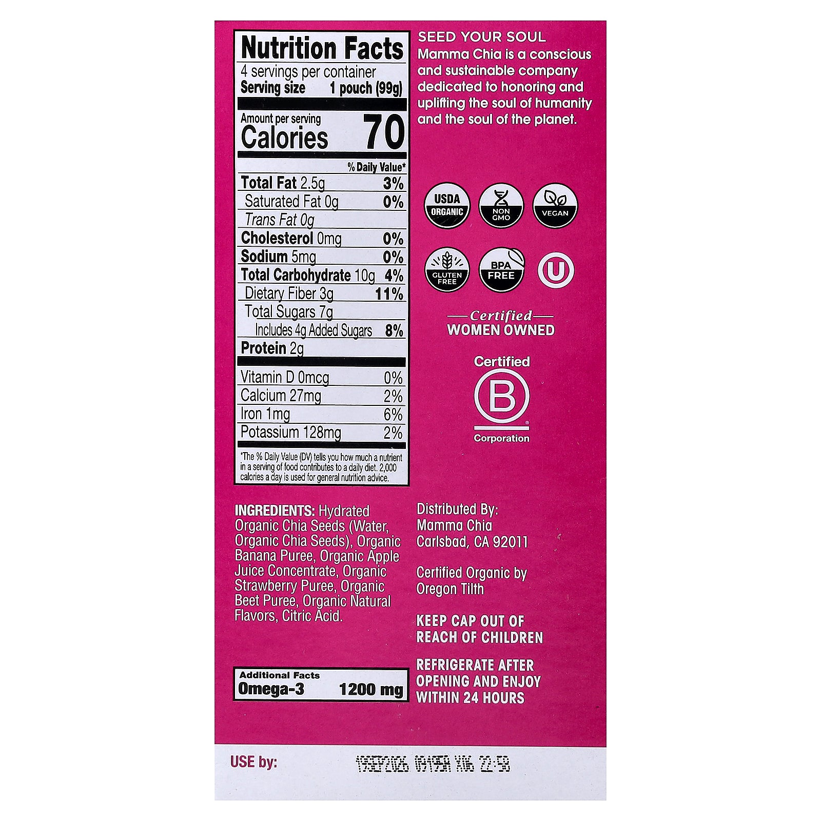 Squeeze some natural vitality and powerful nutrients into your day. Our organic chia seeds are infused with vibrant fruits and vegetables to create a convenient snack for souls of all ages. With plant-based Omega-3 and fiber-rich prebiotics, Chia Squeeze naturally provides the vitality, energy and strength to power your soul's purpose. Enjoy!