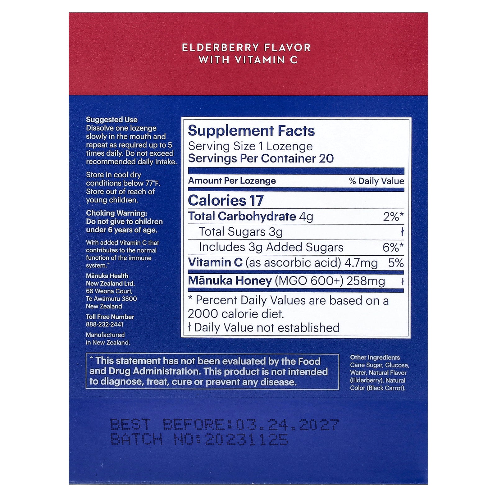 100% natural lozenges made with sustainably harvested New Zealand Manuka honey infused with elderberry. With added Vitamin C that contributes to the normal function of the immune system.