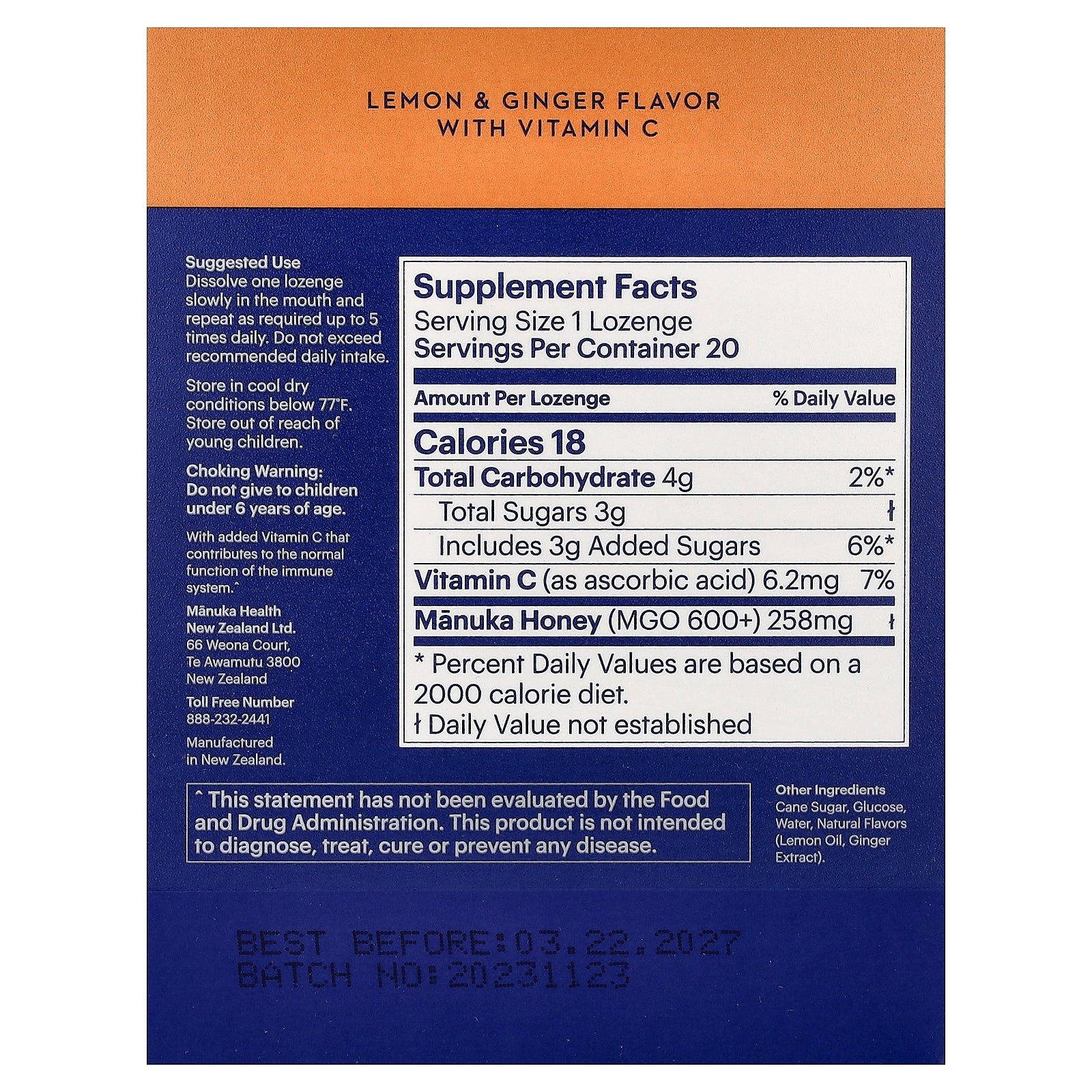 100% natural lozenges made with sustainably harvested New Zealand Manuka honey infused with lemon and ginger. With added Vitamin C that contributes to the normal function of the immune system.