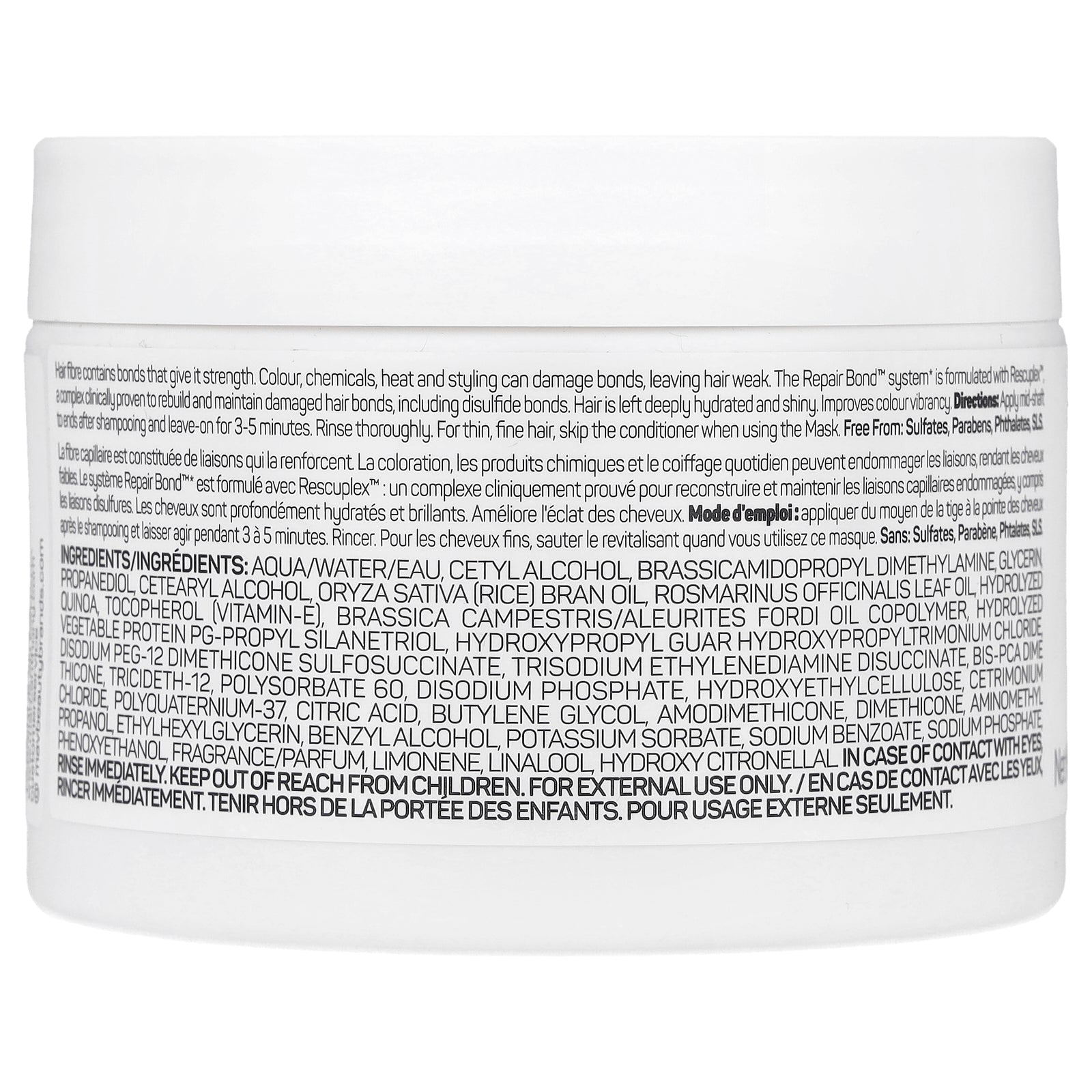Hair fibre contains bonds that give it strength. Colour, chemicals, heat and styling can damage bonds, leaving hair weak. The Repair Bond™ system is formulated with Rescuplex™, a complex clinically proven to rebuild and maintain damaged hair bonds, including disulfide bonds. Hair is left deeply hydrated and shiny. Improves colour vibrancy.