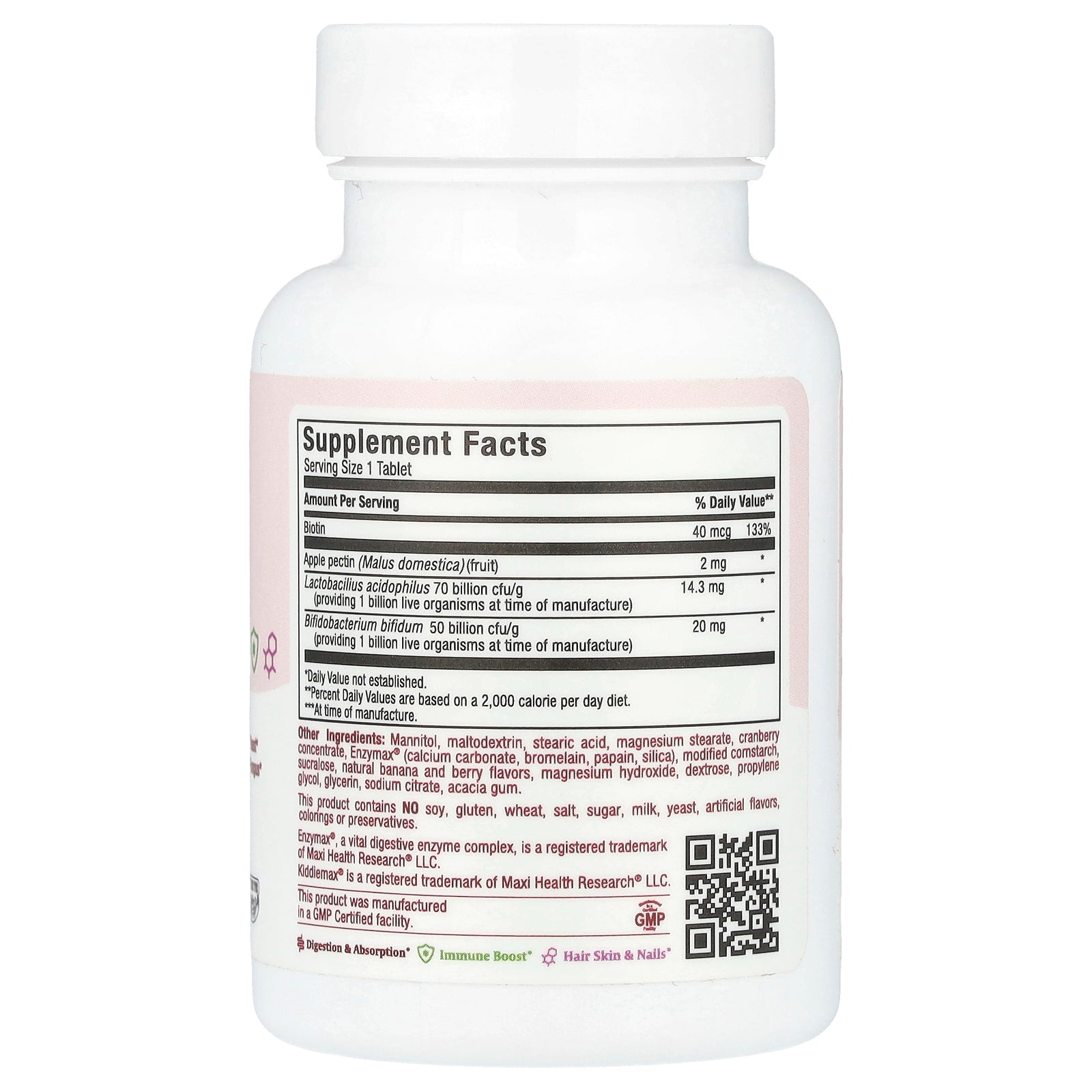 Mannitol, maltodextrin, stearic acid, magnesium stearate, cranberry concentrate, Enzymax® (calcium carbonate, bromelain, papain, silica), modified cornstarch, sucralose, natural banana and berry flavors, magnesium hydroxide, dextrose, propylene glycol, glycerin, sodium citrate, acacia gum.