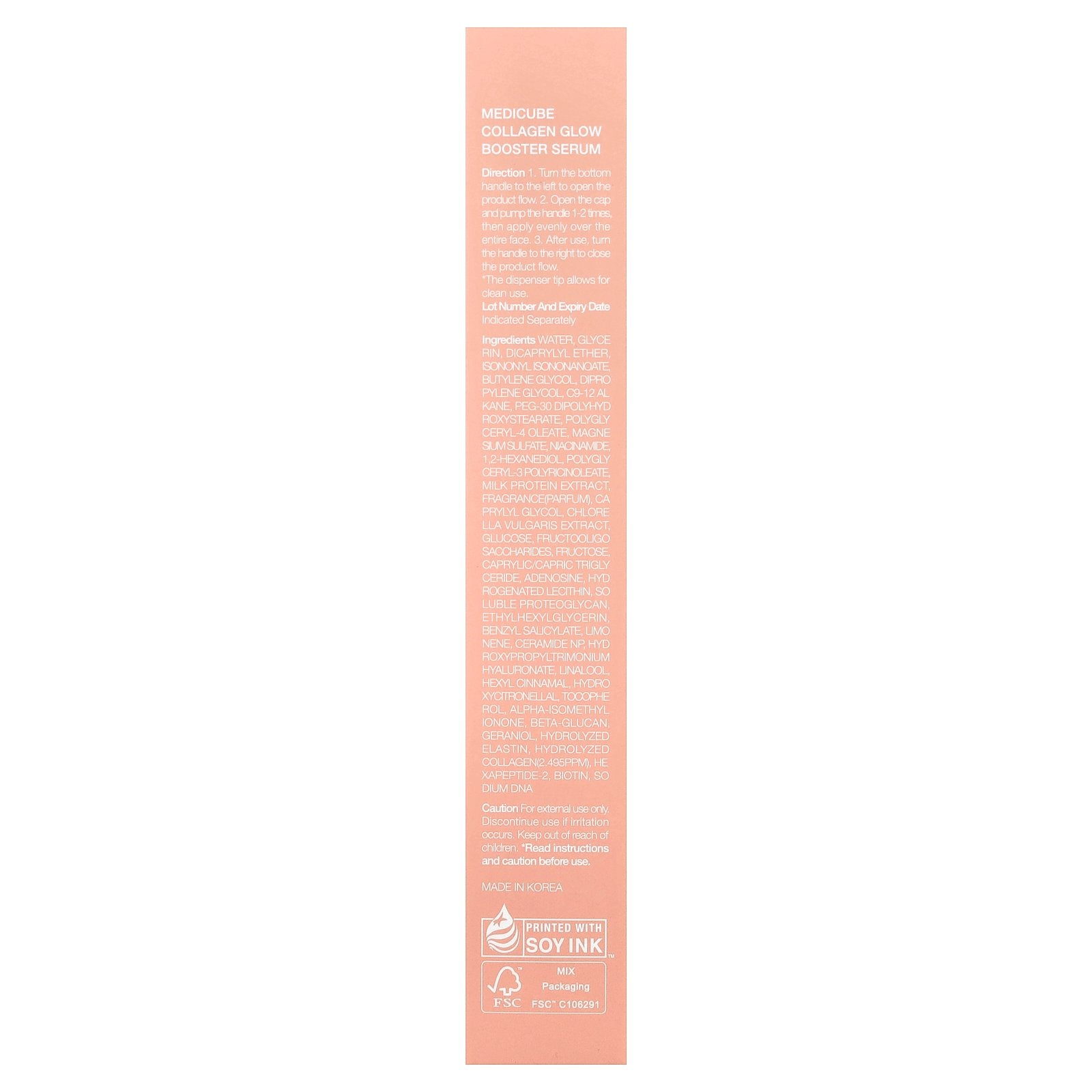 Water, glycerin, dicaprylyl ether, isononyl isononanoate, butylene glycol, dipropylene glycol, c9-12 alkane, peg-30 dipolyhydroxystearate, polyglyceryl-4 oleate, magnesium sulfate, niacinamide, 1,2-hexanediol, polyglyceryl-3 polyricinoleate, milk protein extract, fragrance (parfum), caprylyl glycol, chlorella vulgaris extract, glucose, fructooligo saccharides, fructose, caprylic/capric triglyceride, adenosine, hydrogenated lecithin, soluble proteoglycan, ethylhexylglycerin, benzyl salicylate, limonene, ceramide np, hydroxypropyltrimonium hyaluronate, linalool, hexyl cinnamal, hydroxycitronellal, tocopherol, alpha-isomethyl ionone, beta-glucan, geraniol, hydrolyzed elastin, hydrolyzed collagen (2.495 ppm), hexapeptide-2, biotin, sodium dna.