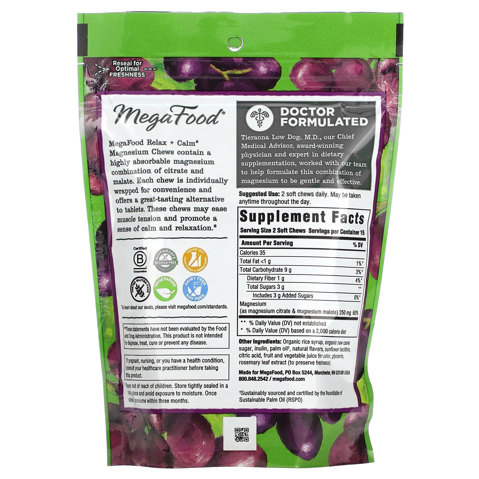 MegaFood Relax + Calm Magnesium Chews contain a highly absorbable magnesium combination of citrate and malate. Each chew is individually wrapped for convenience and offers a great-tasting alternative to tablets. These chews may ease muscle tension and promote a sense of calm and relaxation.