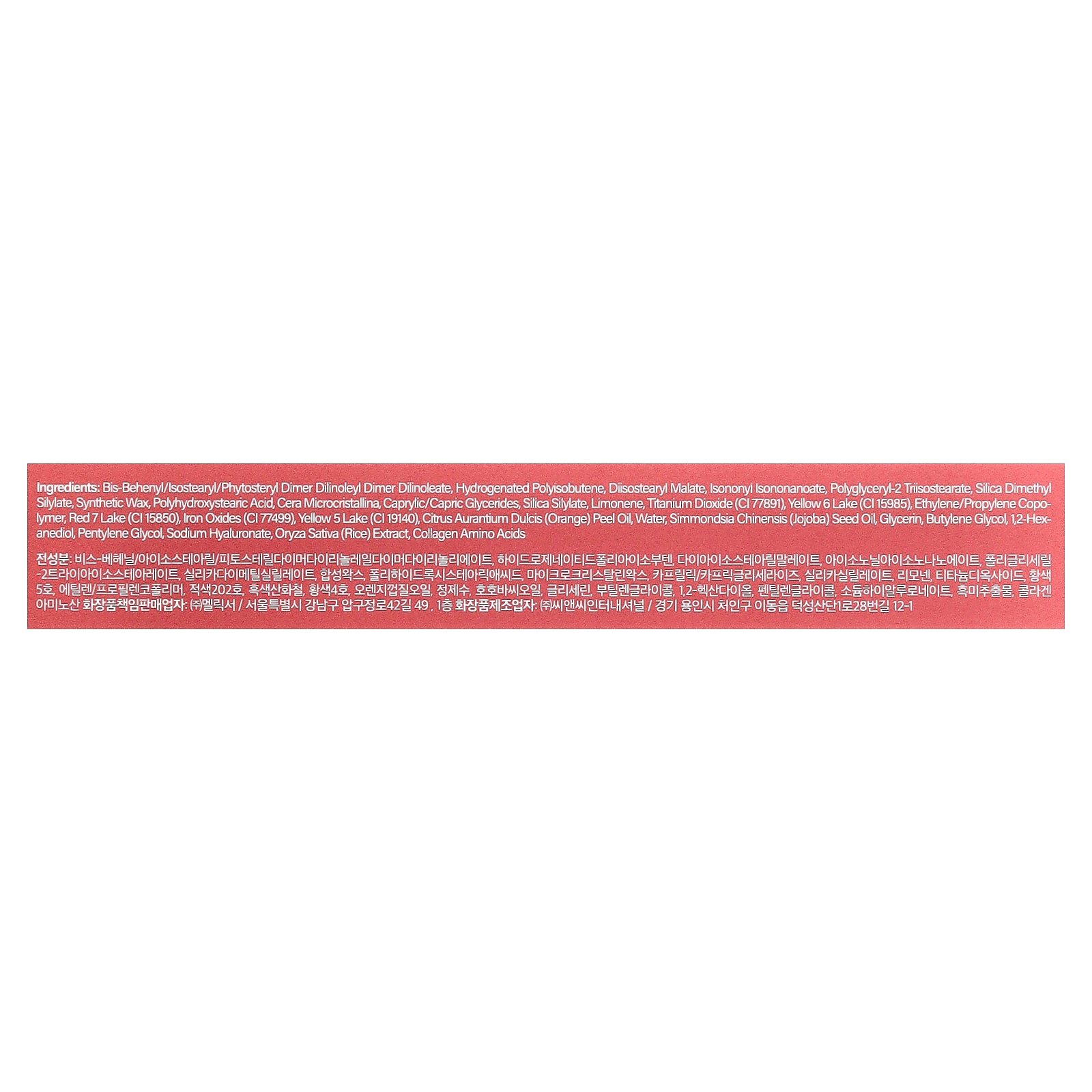 Bis-behenyl/isostearyl/phytosteryl dimer dilinoleyl dimer dilinoleate, hydrogenated polyisobutene, diisostearyl malate, isononyl isononanoate, polyglyceryl-2 triisostearate, silica dimethyl silylate, synthetic wax, polyhydroxystearic acid, cera microcristallina, caprylic/capric glycerides, silica silylate, limonene, titanium dioxide (ci 77891), yellow 6 lake (ci 15985), ethylene/propylene copolymer, red 7 lake (ci 15850), iron oxides (ci 77499), yellow 5 lake (ci 19140), citrus aurantium dulcis (orange) peel oil, water, simmondsia chinensis (jojoba) seed oil, glycerin, butylene glycol, 1,2-hexanediol, pentylene glycol, sodium hyaluronate, oryza sativa (rice) extract, collagen amino acids.