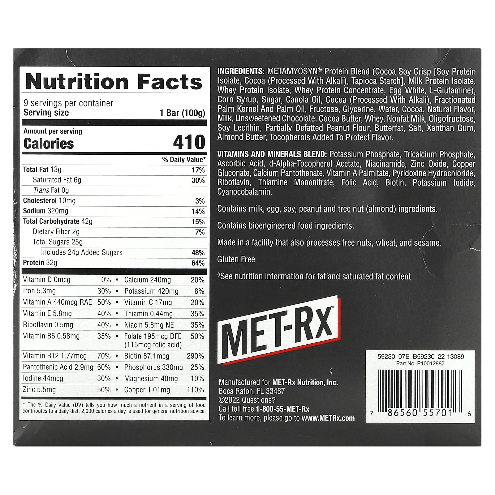 METAMYOSYN® protein blend (cocoa soy crisp [soy protein isolate, cocoa (processed with alkali), tapioca starch], milk protein isolate, whey protein isolate, whey protein concentrate, egg white, l-glutamine), corn syrup, sugar, canola oil, cocoa (processed with alkali), fractionated palm kernel and palm oil, fructose, glycerine, water, cocoa, natural flavor, milk, unsweetened chocolate, cocoa butter, whey, nonfat milk, oligofructose, soy lecithin, partially defatted peanut flour, butterfat, salt, xanthan gum, almond butter, tocopherols added to protect flavor.
