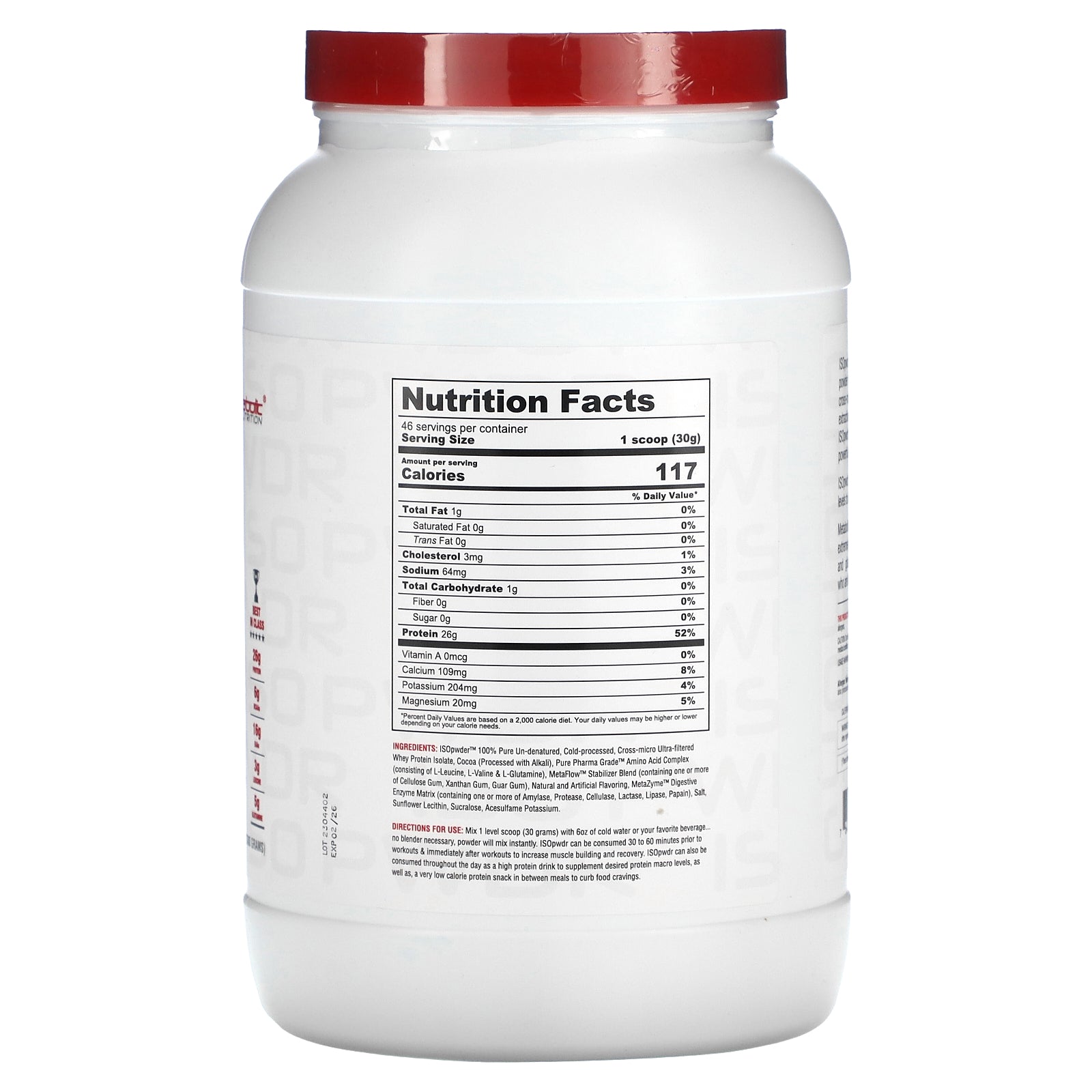 ISOpwdr™ 100% pure un-denatured, cold-processed, cross-micro ultra-filtered whey protein isolate, cocoa (processed with alkali), Pure Pharma Grade™ amino acid complex (consisting of l-leucine, l-valine & l-glutamine), MetaFlow™ stabilizer blend containing one or more of cellulose gum, xanthan gum, guar gum), natural and artificial flavoring, MetaZyme™ digestive enzyme matrix containing one or more of amylase, protease, cellulase, lactase, lipase, papain), salt, sunflower lecithin, sucralose, acesulfame potassium.