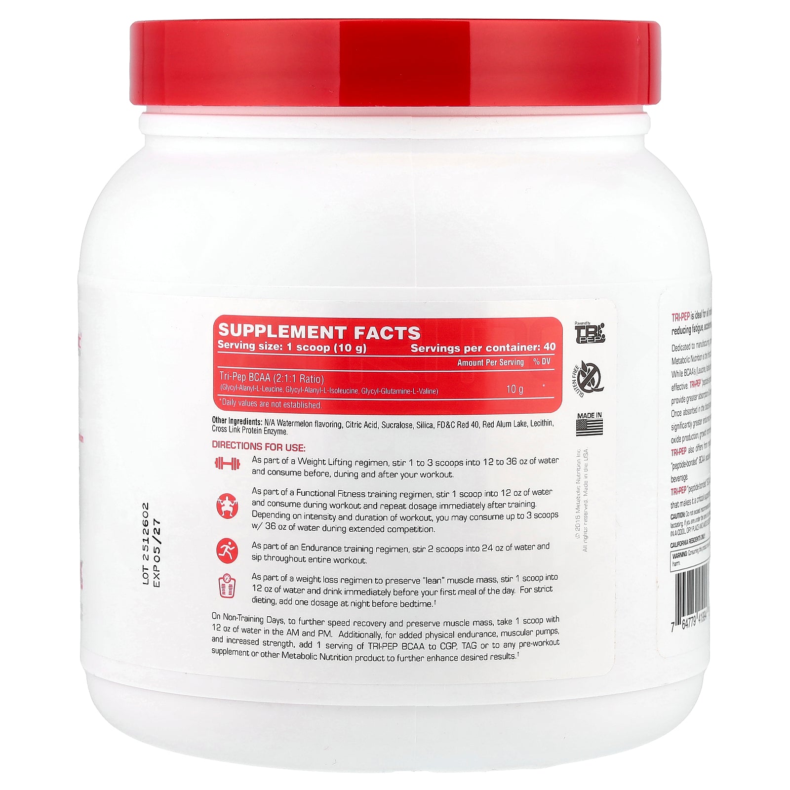 Dedicated to manufacturing physician formulated nutritional supplements, backed by scientific research and formulated by a medical doctor; Metabolic Nutrition is the first to develop and introduce TRI-PEP ... the only designer "peptide-bonded" BCAA in the marketplace. While BCAA's [Leucine, Isoleucine, and Valine) are essential ... regular free-form BCAA's are missing critical co-factors to make BCAA metabolism effective. TRI-PEP "peptide-bonded" BCAA contains the correct ratio of these critical metabolic co-factors in its unique chemical structure to provide greater absorption & bioavailability ... thus, increasing blood plasma amino concentrations, which result in greater muscle BCAA saturation. Once absorbed in the blood-stream, TRI-PEP "peptide-bonded" BCAA elevate muscle glycogen levels and inhibit lactic acid buildup, allowing for significantly greater endurance while preventing lean muscle tissue breakdown. TRI-PEP additionally supports improved protein synthesis, nitric oxide production, growth hormone levels and IGF-1 release ... to preserve and enhance lean muscle. TRI-PEP also differs from regular and instantized BCAA's which have a reputation of mixing poorly and bitter-chemical aftertaste. TRI-PEP "peptide-bonded" BCAA exclusive HYDRA-SORB™ process ... mixes easily and provides a great flavor profile when mixed in water or your favorite beverage.