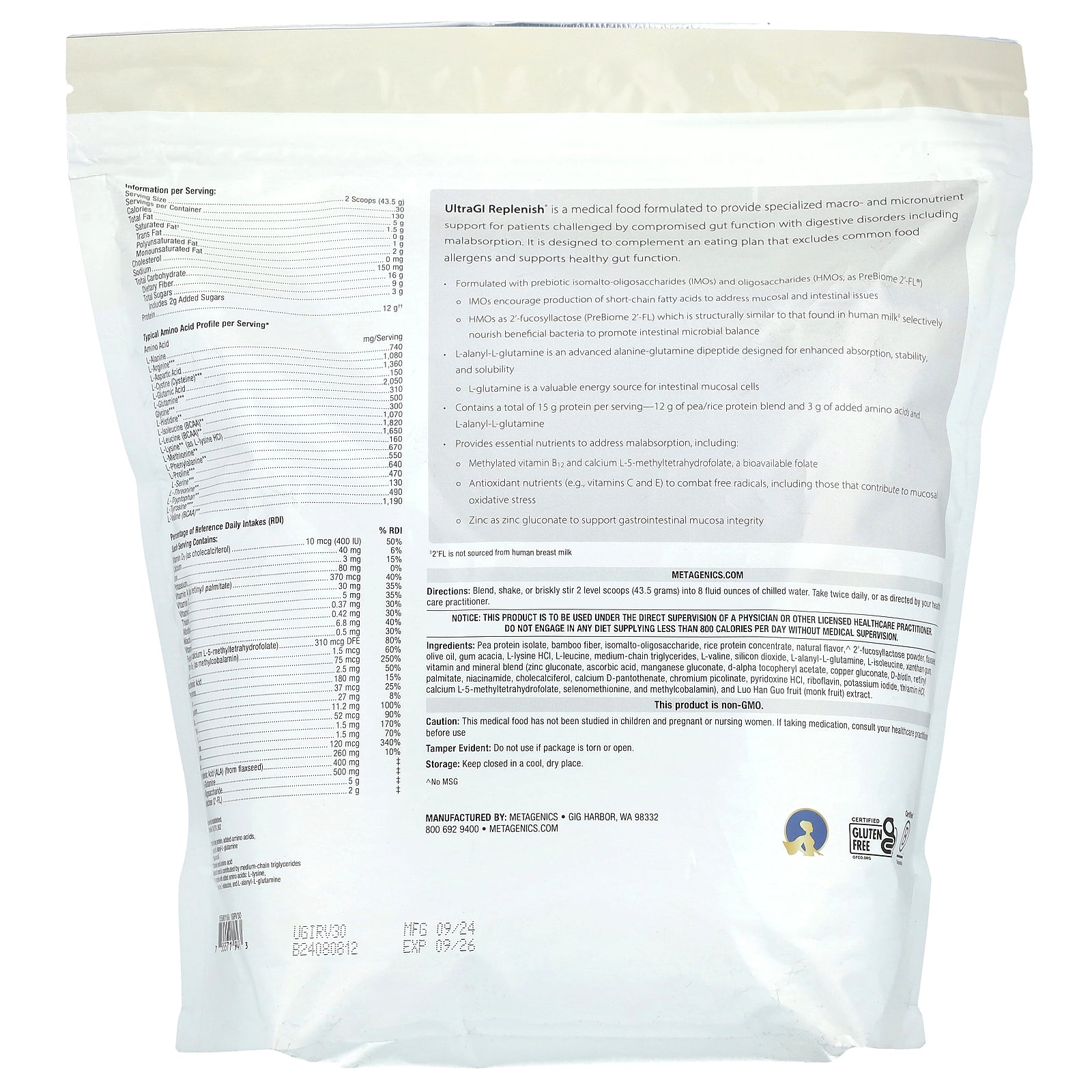 UltraGl Replenish® is a medical food formulated to provide specialized macro- and micronutrient support for patients challenged by compromised gut function with digestive disorders including malabsorption. It is designed to complement an eating plan that excludes common food allergens and supports healthy gut function.