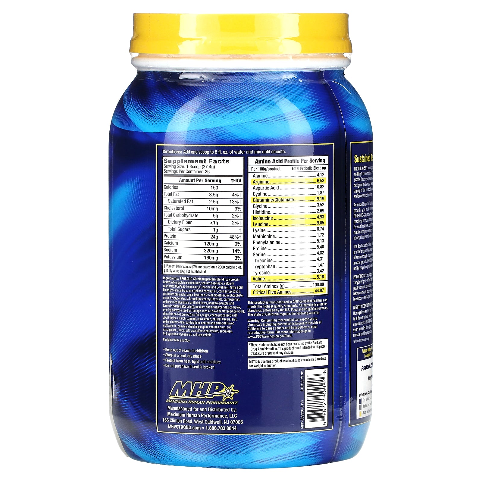 Amino acids are the building blocks for muscle tissue. In order to achieve maximum muscle growth, you must have an adequate supply of amino acids to feed your muscles. PROBOLIC-SR's bio-efficient protein matrix of whey concentrate, soy isolate and casein is precisely formulated to supply all nine essential amino acids plus high levels of the Critical Five Amino Acids. Aside from providing a high concentration of amino acids, this protein matrix also provides a fast, medium and slow "release profile," which improves bioavailability, nitrogen retention and prolongs it's anabolic effects.+