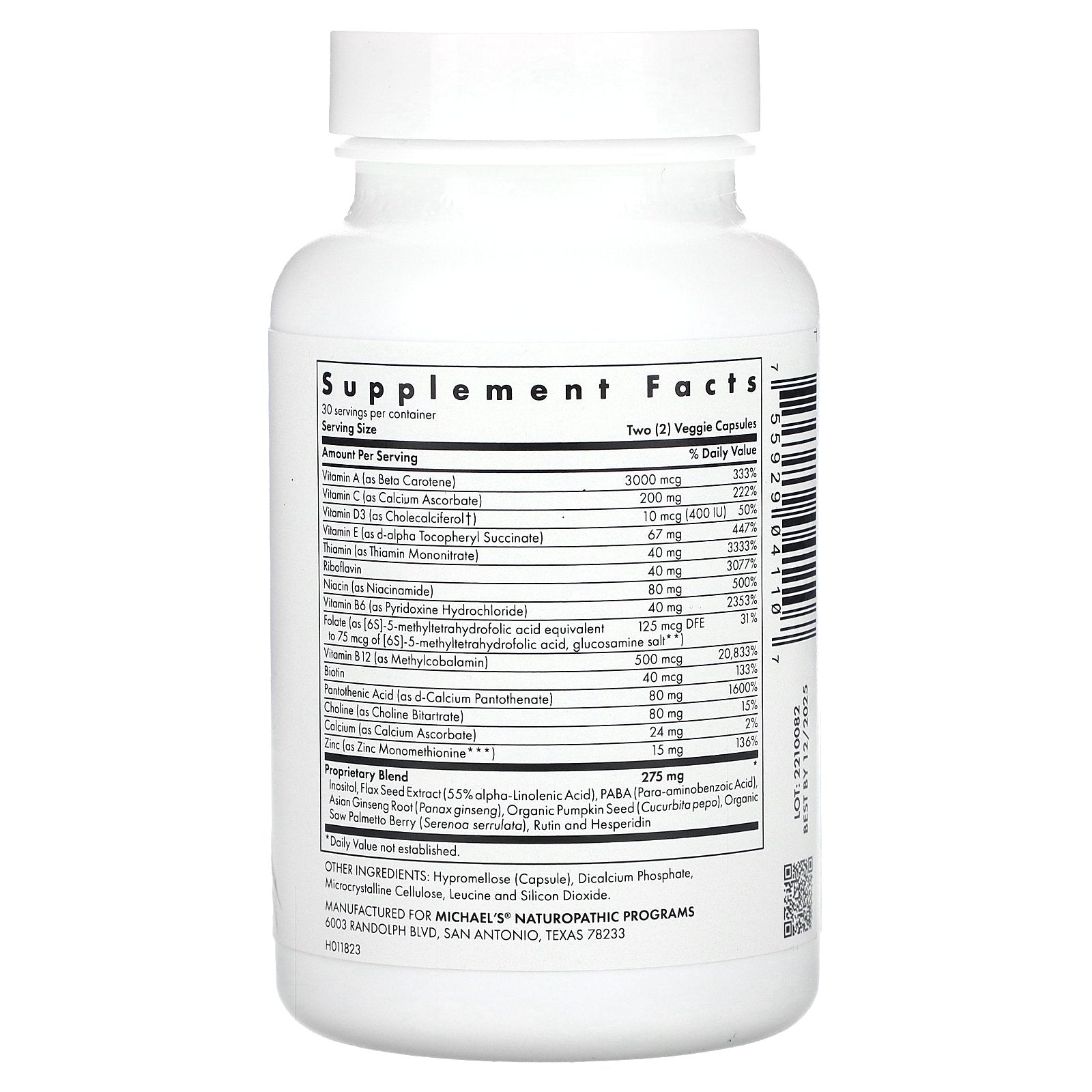 Proprietary Blend Inositol, Flax Seed Extract (55% alpha-Linolenic Acid), PABA (Para-aminobenzoic Acid), Asian Ginseng Root (Panax ginseng), Organic Pumpkin Seed (Cucurbita pepo), Organic Saw Palmetto Berry (Serenoa serrulata), Rutin and Hesperidin |