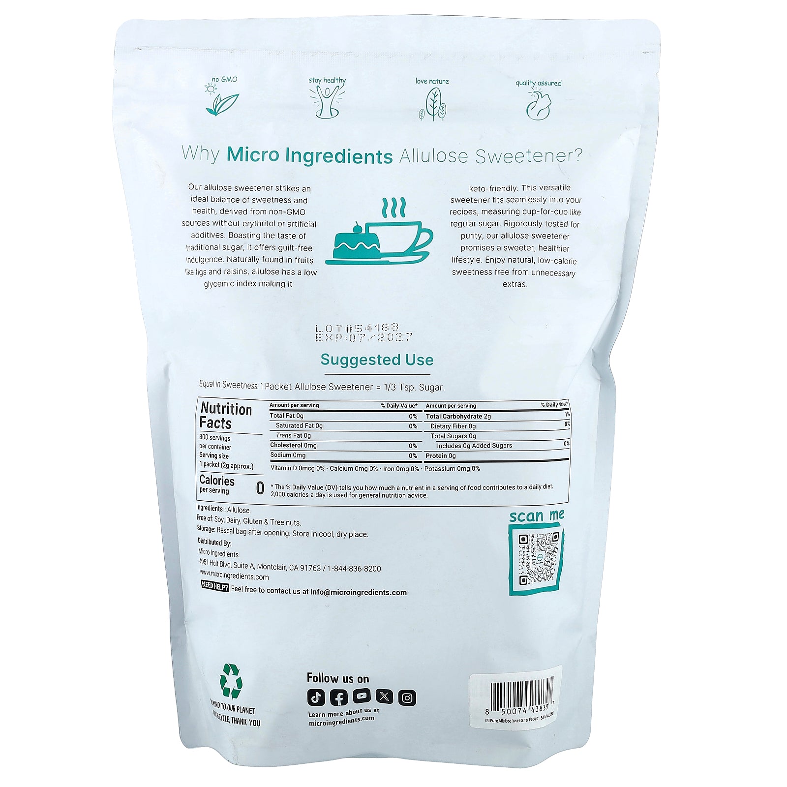 Equal in sweetness: 1 packet allulose sweetener = 1/3 tsp. sugar.