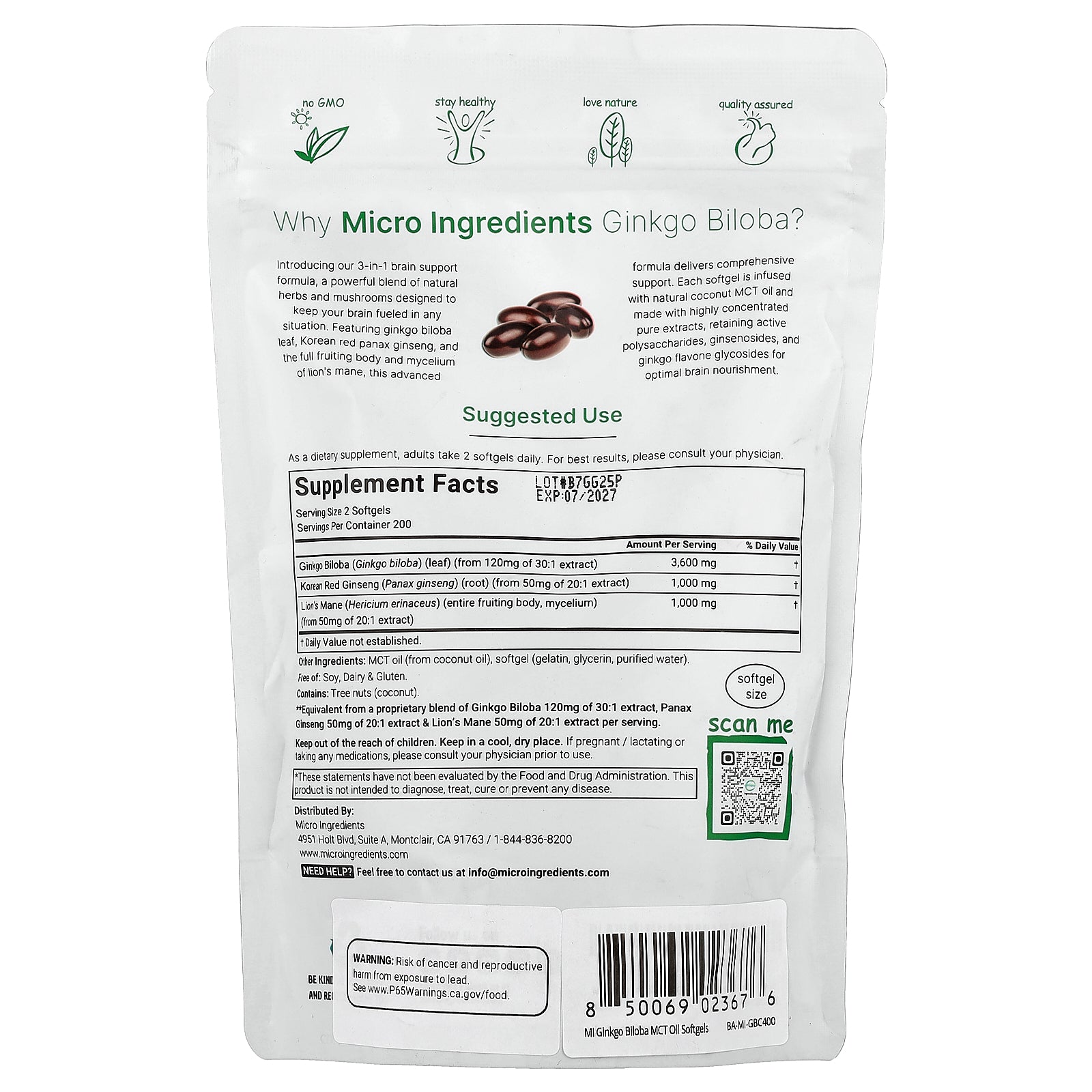 Introducing our 3-in-1 brain support formula, a powerful blend of natural herbs and mushrooms designed to keep your brain fueled in any situation. Featuring ginkgo biloba leaf, Korean red panax ginseng, and the full fruiting body and mycelium of lion's mane, this advanced formula delivers comprehensive support. Each softgel is infused with natural coconut MCT oil and made with highly concentrated pure extracts, retaining active polysaccharides, ginsenosides, and ginkgo flavone glycosides for optimal brain nourishment.