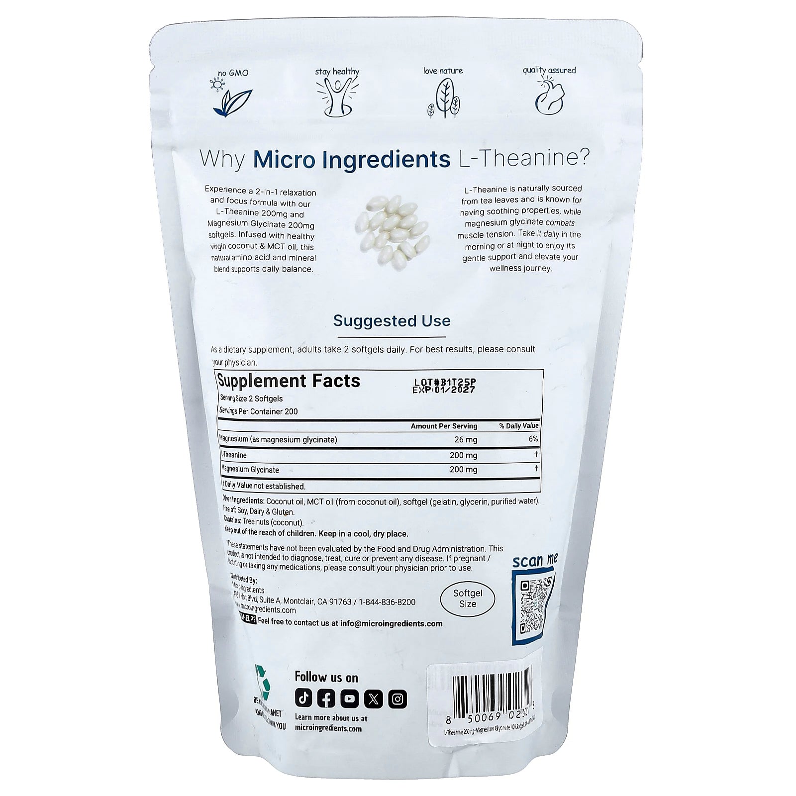 Experience a 2-in-1 relaxation and focus formula with our L-Theanine 200 mg and Magnesium Glycinate 200 mg softgels. Infused with healthy virgin coconut & MCT oil, this natural amino acid and mineral blend supports daily balance. L-Theanine is naturally sourced from tea leaves and is known for having soothing properties, while magnesium glycinate combats muscle tension. Take it daily in the morning or at night to enjoy its gentle support and elevate your wellness journey.