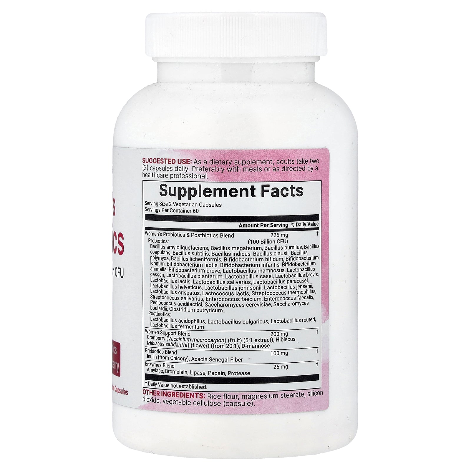 120 natural vegetarian capsules per bottle. A powerful complex for women that includes Bifidobacterium and Lactobacillus strains, along with Cranberry, Hibiscus, D-Mannose, Acacia Fiber, Bromelain, and more.