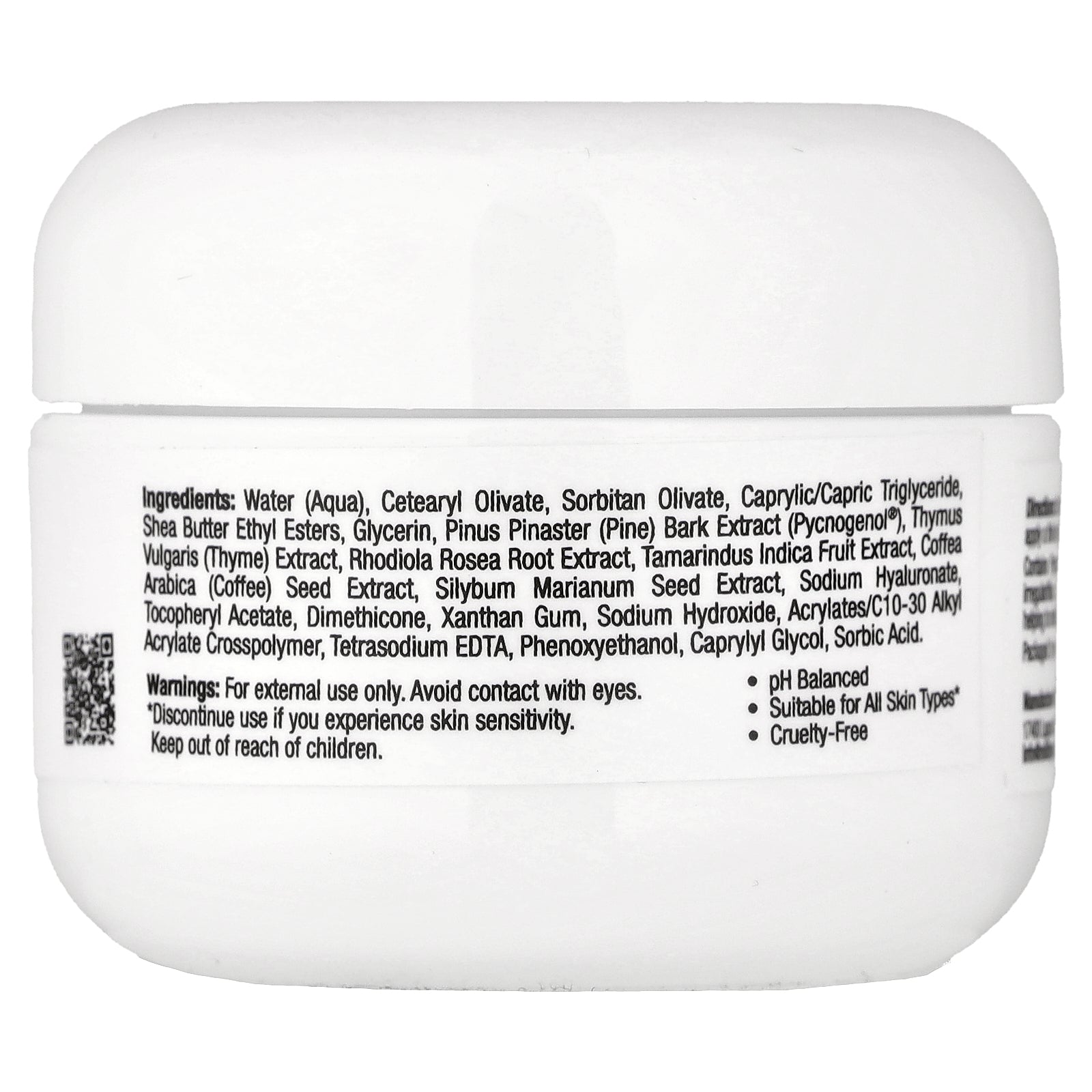 Water (Aqua), Cetearyl Olivate, Sorbitan Olivate, Caprylic/Capric Triglyceride, Shea Butter Ethyl Esters, Glycerin, Pinus Pinaster (Pine) Bark Extract (Pycnogenol®), Thymus Vulgaris (Thyme) Extract, Rhodiola Rosea Root Extract, Tamarindus Indica Fruit Extract, Coffea Arabica (Coffee) Seed Extract, Silybum Marianum Seed Extract, Sodium Hyaluronate Tocopheryl Acetate, Dimethicone, Xanthan Gum, Sodium Hydroxide, Acrylates/C10-30 Alkyl Acrylate Crosspolymer, Tetrasodium EDTA, Phenoxyethanol, Caprylyl Glycol, Sorbic Acid.