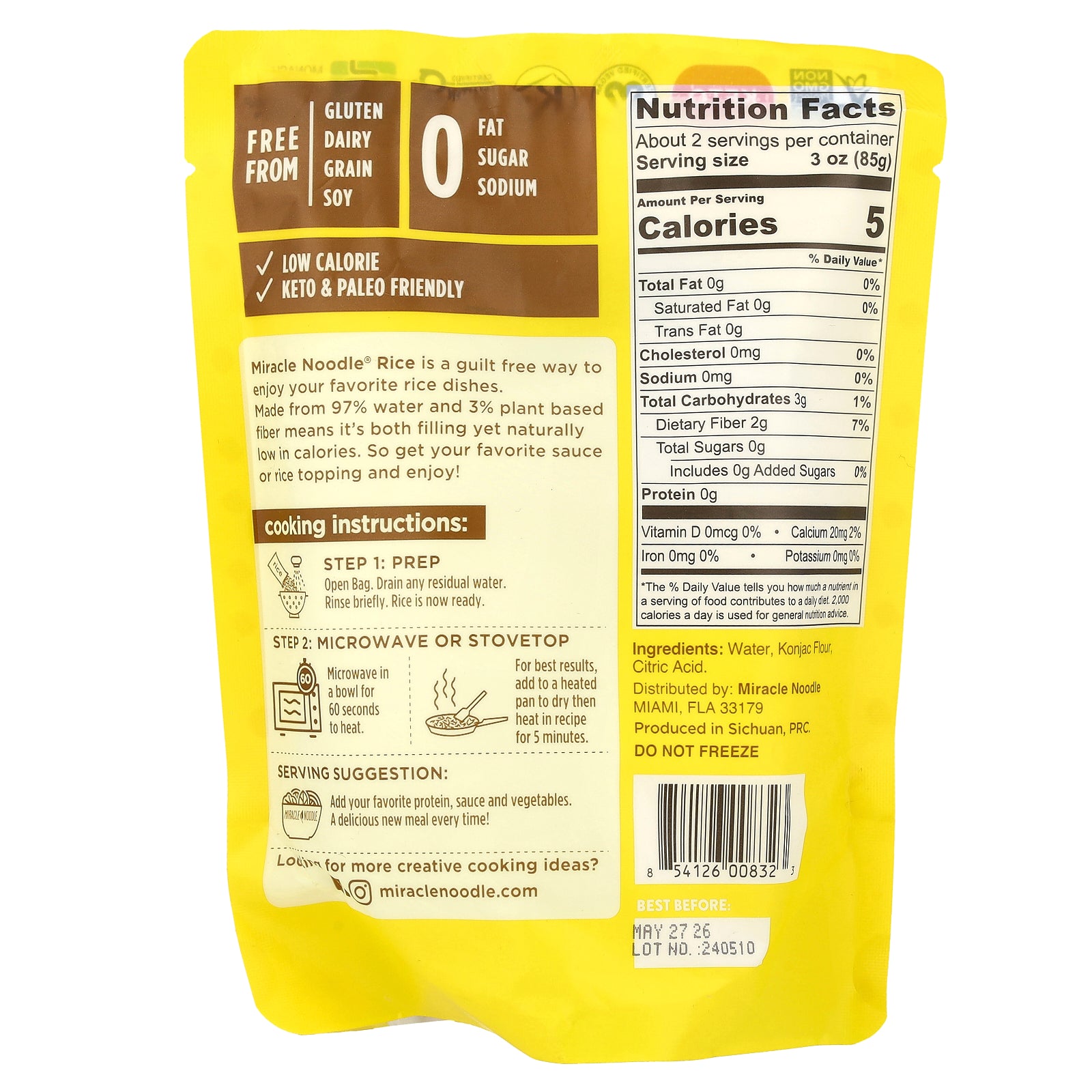 Miracle Noodle® Rice is a guilt free way to enjoy your favorite rice dishes. Made from 97% water and 3% plant based fiber means it's both filling yet naturally low in calories. So get your favorite sauce or rice topping and enjoy!