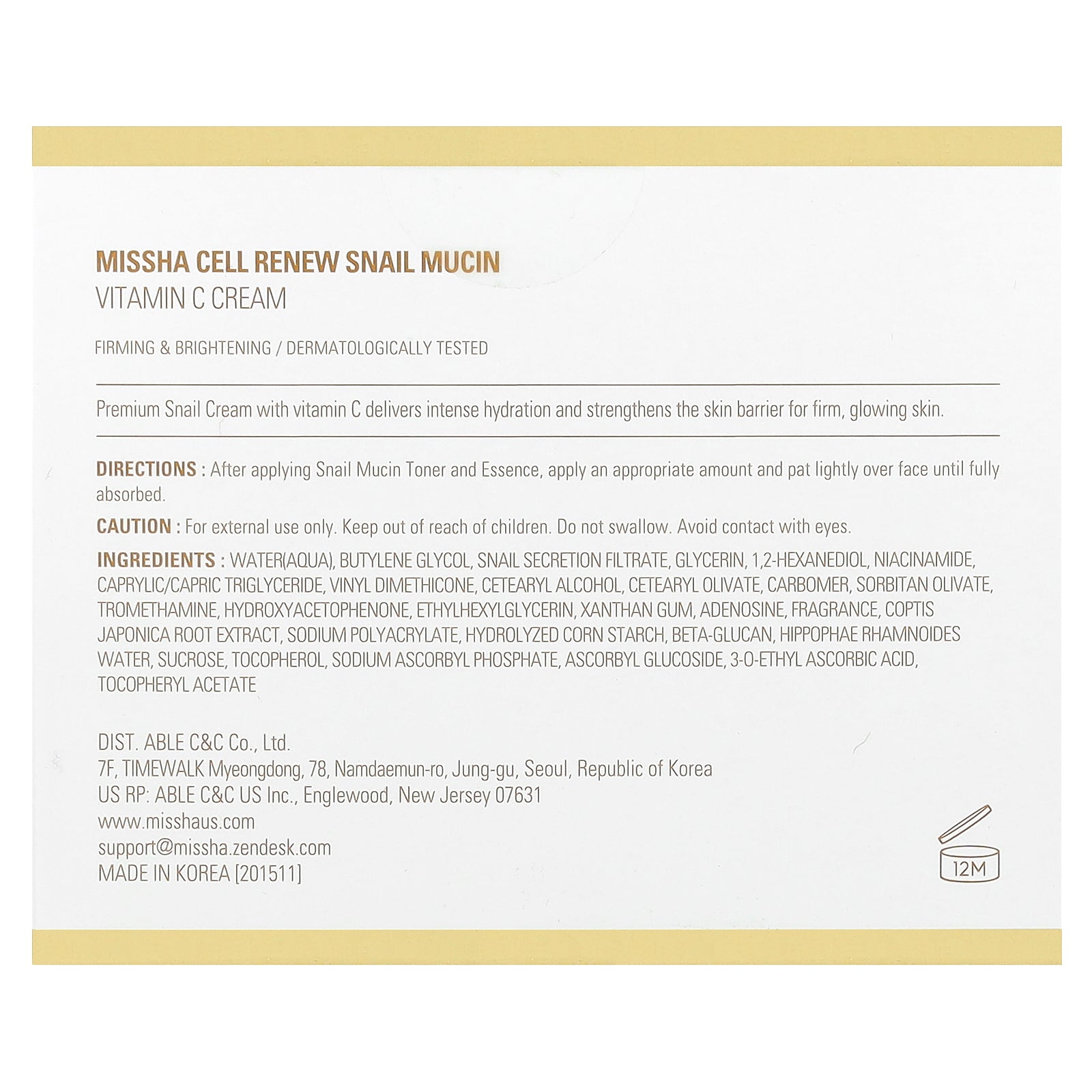 Water, butylene glycol, snail secretion filtrate, glycerin, 1,2-hexanediol, niacinamide, caprylic/capric triglyceride, vinyl dimethicone, cetearyl alcohol, cetearyl olivate, carbomer, sorbitan olivate, tromethamine, hydroxyacetophenone, ethylhexylglycerin, xanthan gum, adenosine, fragrance, coptis japonica root extract, sodium polyacrylate, hydrolyzed corn starch, beta-glucan, hippophae rhamnoides water, sucrose, tocopherol, sodium ascorbyl phosphate, ascorbyl glucoside, 3-0-ethyl ascorbic acid, tocopheryl acetate.