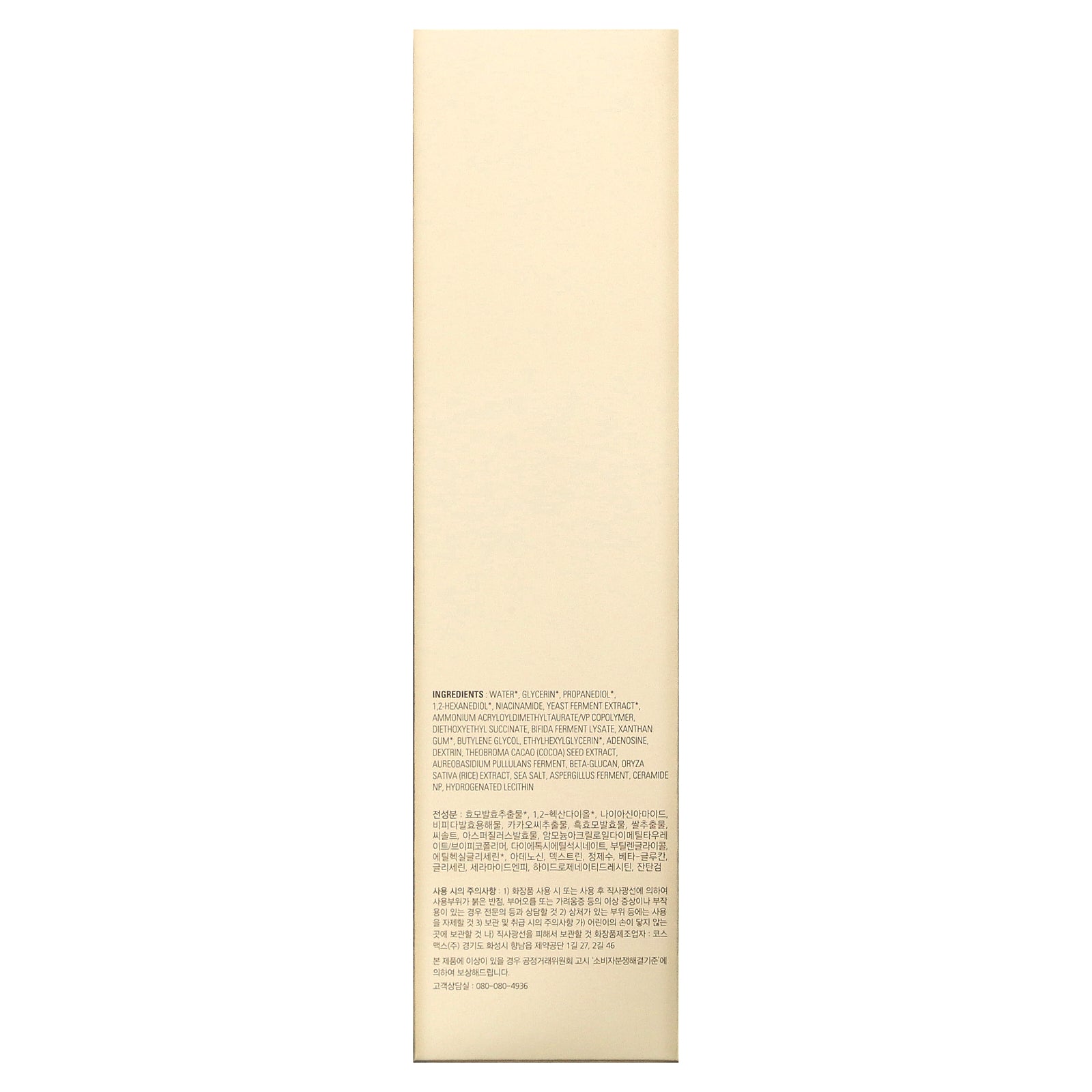 Water, glycerin, propanediol, 1,2-hexanediol, niacinamide, yeast ferment extract, ammonium acryloyldimethyltaurate/vp copolymer, diethoxyethyl succinate, bifida ferment lysate, xanthan gum, butylene glycol, ethylhexylglycerin, adenosine, dextrin, theobroma cacao (cocoa) seed extract, aureobasidium pullulans ferment, beta-glucan, oryza sativa (rice) extract, sea salt, aspergillus ferment, ceramide np, hydrogenated lecithin.