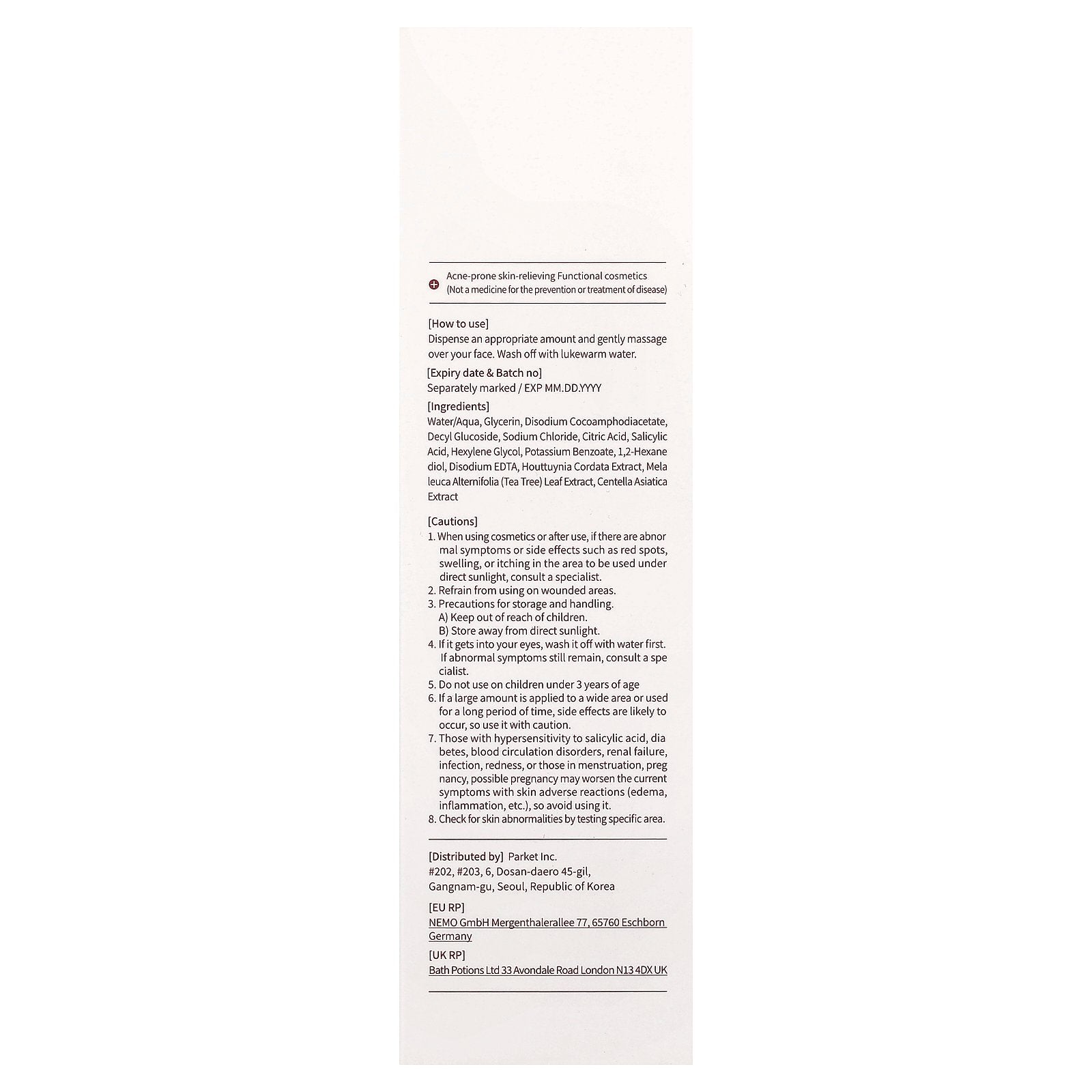 Water/aqua, glycerin, disodium cocoamphodiacetate, decyl glucoside, sodium chloride, citric acid, salicylic acid, hexylene glycol, potassium benzoate, 1,2-hexanediol, disodium edta, houttuynia cordata extract, melaleuca alternifolia (tea tree) leaf extract, centella asiatica extract.