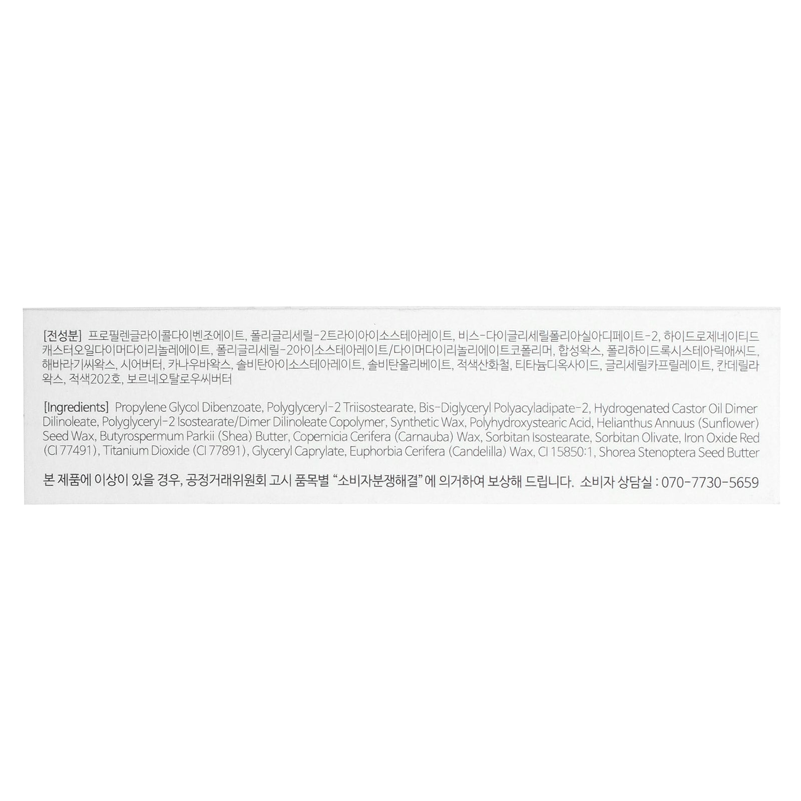Propylene glycol dibenzoate, polyglyceryl-2 triisostearate, bis-diglyceryl polyacyladipate-2, hydrogenated castor oil dimer dilinoleate, polyglyceryl-2 isostearate/dimer dilinoleate copolymer, synthetic wax, polyhydroxystearic acid, helianthus annuus (sunflower) seed wax, butyrospermum parkii (shea) butter, copernicia cerifera (carnauba) wax, sorbitan isostearate, sorbitan olivate, iron oxide red (ci 77491), titanium dioxide (ci 77891), glyceryl caprylate, euphorbia cerifera (candelilla) wax, ci 15850:1, shorea stenoptera seed butter.