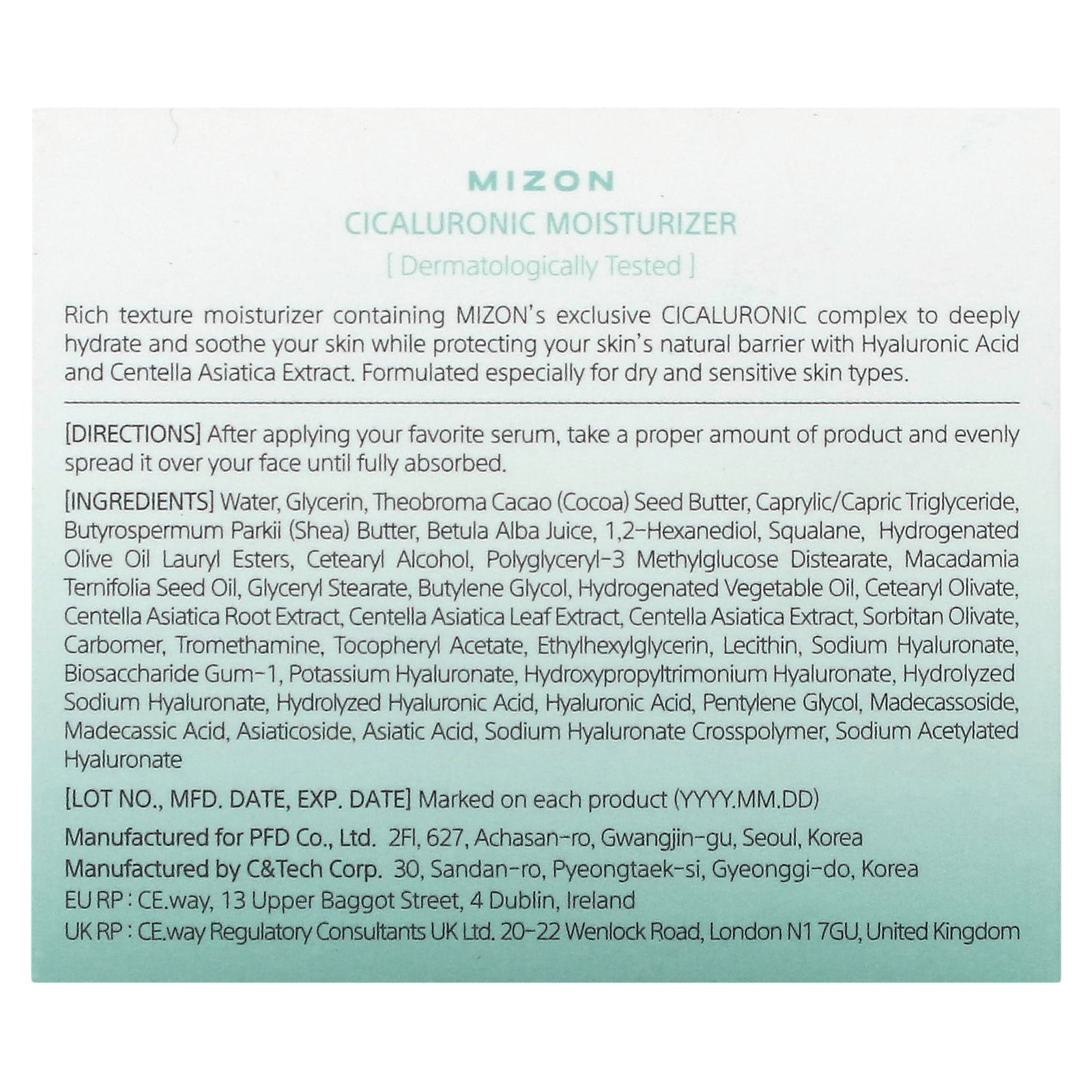 Rich texture moisturizer containing Mizon's exclusive Cicaluronic complex to deeply hydrate and soothe your skin while protecting your skin's natural barrier with Hyaluronic Acid and Centella Asiatica Extract. Formulated especially for dry and sensitive skin types.