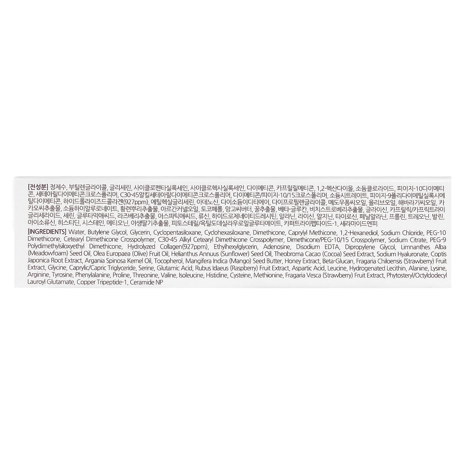 Water, butylene glycol, glycerin, cyclopentasiloxane, cyclohexasiloxane, dimethicone, caprylyl methicone, 1,2-hexanediol, sodium chloride, PEG-10 dimethicone, cetearyl dimethicone crosspolymer, C30-45 alkyl cetearyl dimethicone crosspolymer, dimethicone/peg-10/15 crosspolymer, sodium citrate, PEG-9 polydimethylsiloxyethyl dimethicone, hydrolyzed collagen(927ppm), ethylhexylglycerin, adenosine, disodium EDTA, dipropylene glycol, limnanthes alba (meadowfoam) seed oil, olea europaea (olive) fruit oil, helianthus annuus (sunflower) seed oil, theobroma cacao (cocoa) seed extract, sodium hyaluronate, coptis japonica root extract, argania spinosa kernel oil, tocopherol, mangifera indica (mango) seed butter, honey extract, beta-glucan, fragaria chiloensis (strawberry) fruit extract, glycine, caprylic/capric triglyceride, serine, glutamic acid, rubus idaeus (raspberry) fruit extract, aspartic acid, leucine, hydrogenated lecithin, alanine, lysine, arginine, tyrosine, phenylalanine, proline, threonine, valine, isoleucine, histidine, cysteine, methionine, fragaria vesca (strawberry) fruit extract, phytosteryl/octyldodecyl lauroyl glutamate, copper tripeptide-1, ceramide NP.