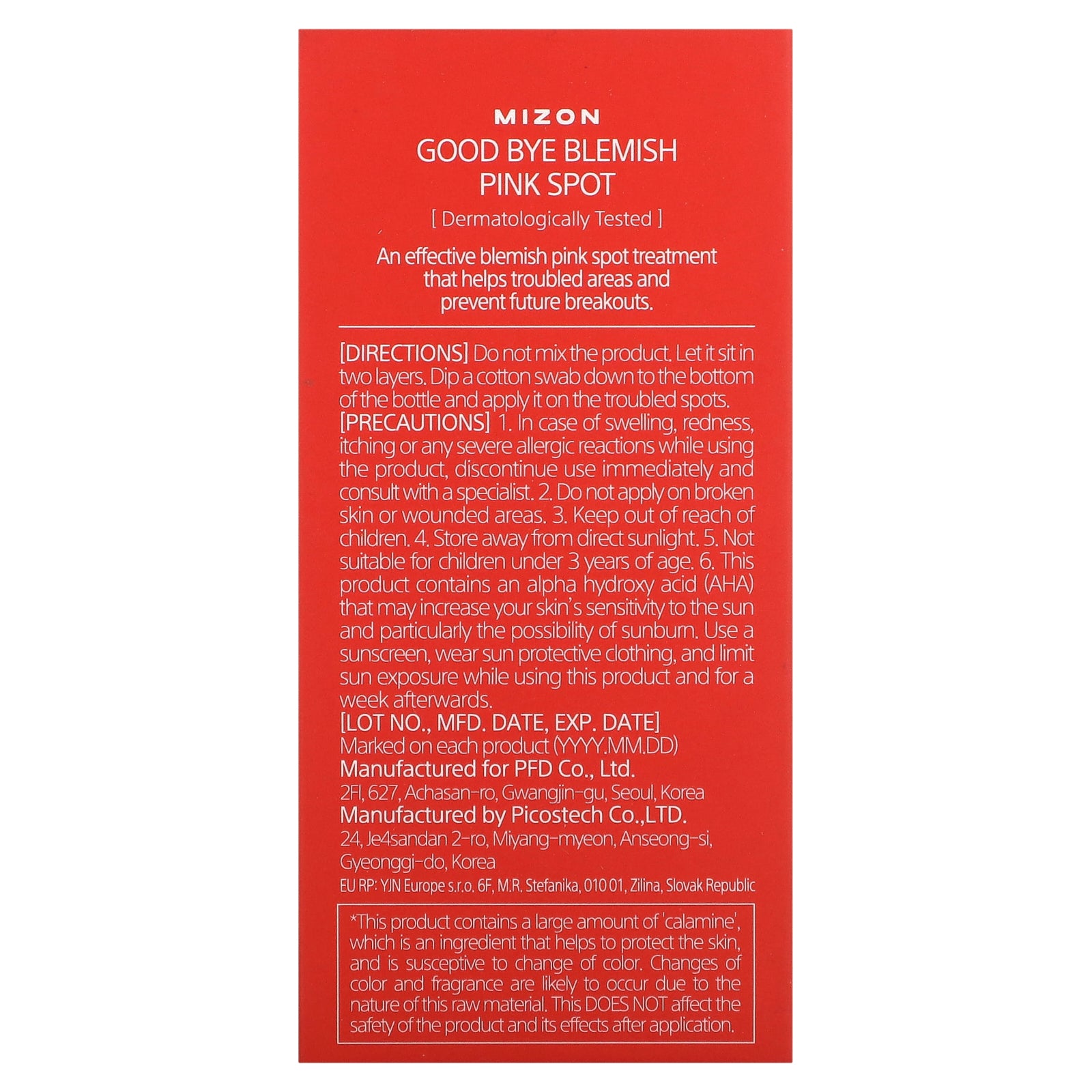 Water, alcohol, glycerin, calamine, coptis japonica root extract, zinc oxide, dimethyl sulfone, glycolic acid, camphor, salicylic acid, peg-60 hydrogenated castor oil, butylene glycol, propanediol, 1,2-hexanediol, centella asiatica extract, houttuynia cordata extract, salvia hispanica seed extract, portulaca oleracea extract, citrus limon (lemon) fruit extract, melaleuca alternifolia (tea tree) leaf extract, melaleuca alternifolia (tea tree) leaf oil, vaccinium macrocarpon (cranberry) fruit extract, rubus idaeus (raspberry) fruit extract, prunus serotina (wild cherry) fruit extract, cornus officinalis fruit extract, punica granatum fruit extract, citrus aurantium dulcis (orange) peel oil, silica, caprylyl glycol, illicium verum (anise) fruit extract, ethylhexylglycerin.