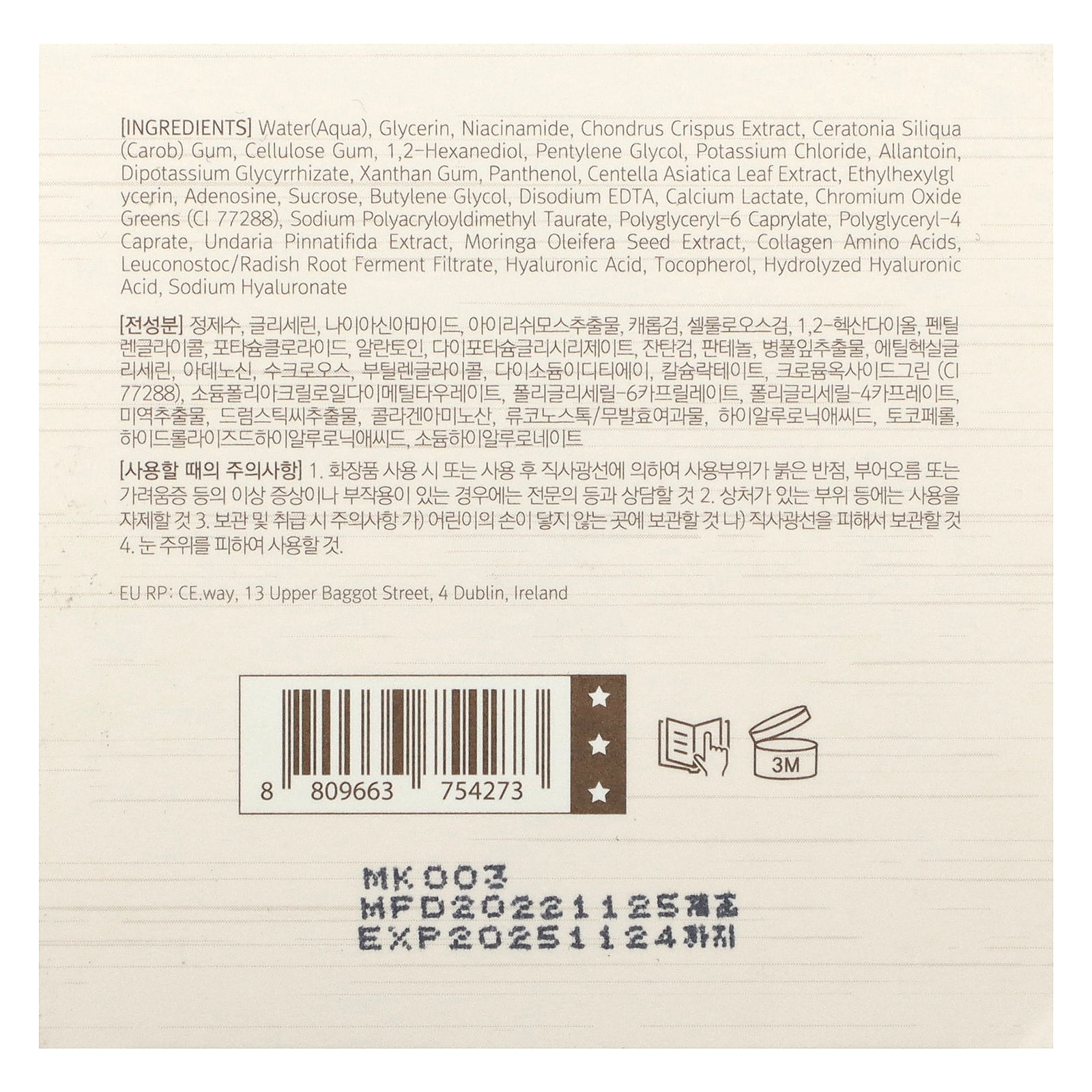 Water(aqua), glycerin, niacinamide, chondrus crispus extract, ceratonia siliqua (carob) gum, cellulose gum, 1,2-hexanediol, pentylene glycol, potassium chloride, allantoin, dipotassium glycyrrhizate, xanthan gum, panthenol, centella asiatica leaf extract, ethylhexylglycerin, adenosine, sucrose, butylene glycol, disodium edta, calcium lactate, chromium oxide greens (ci 77288), sodium polyacryloyldimethyl taurate, polyglyceryl-6 caprylate, polyglyceryl-4 caprate, undaria pinnatifida extract, moringa oleifera seed extract, collagen amino acids, leuconostoc/radish root ferment filtrate, hyaluronic acid, tocopherol, hydrolyzed hyaluronic acid, sodium hyaluronate.