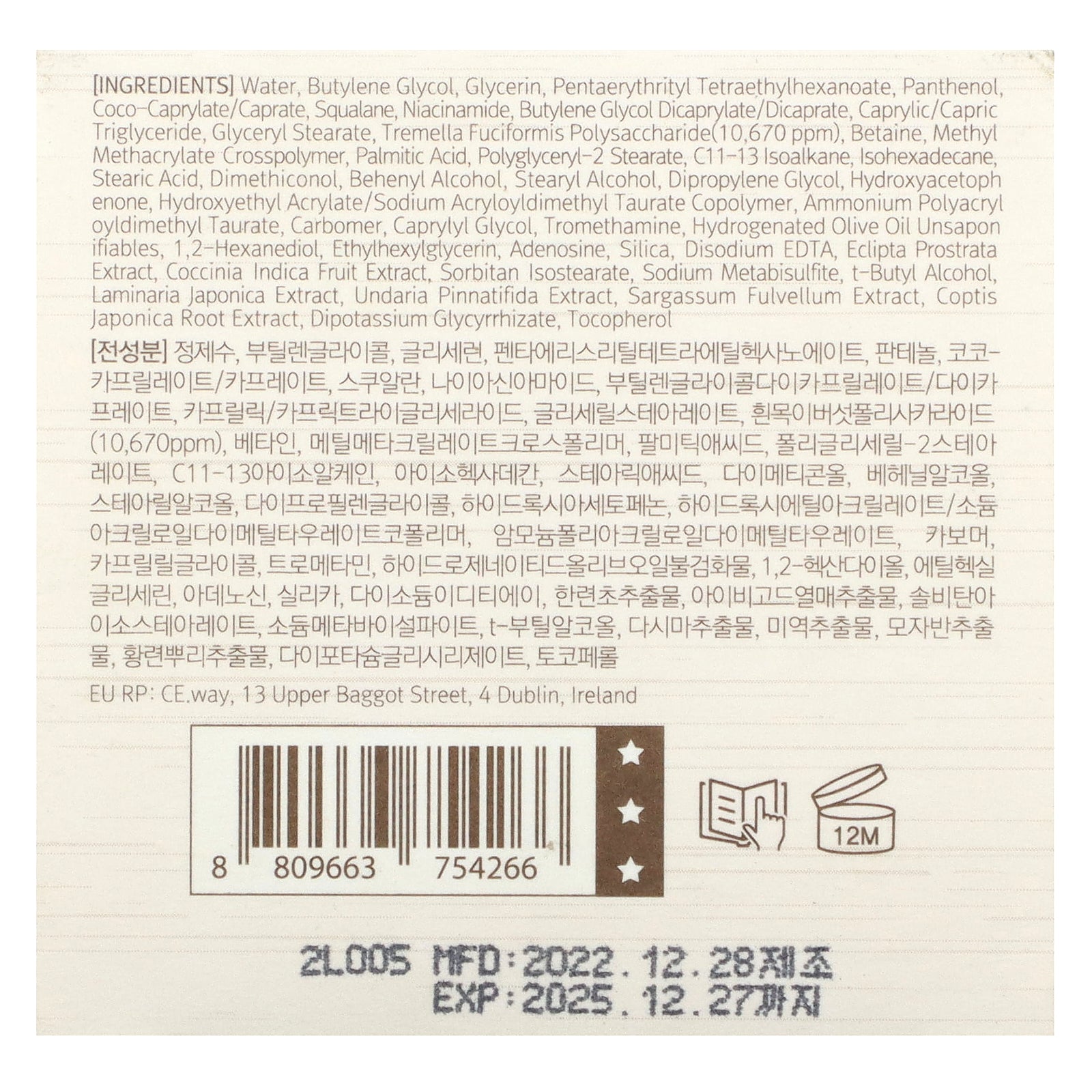 Water, butylene glycol, glycerin, pentaerythrityl tetraethylhexanoate, panthenol, coco-caprylate/caprate, squalane, niacinamide, butylene glycol dicaprylate/dicaprate, caprylic/capric triglyceride, glyceryl stearate, tremella fuciformis polysaccharide(10,670 ppm), betaine, methyl methacrylate crosspolymer, palmitic acid, polyglyceryl-2 stearate, c11-13 isoalkane, isohexadecane, stearic acid, dimethiconol, behenyl alcohol, stearyl alcohol, dipropylene glycol, hydroxyacetophenone, hydroxyethyl acrylate/sodium acryloyldimethyl taurate copolymer, ammonium polyacryloyldimethyl taurate, carbomer, caprylyl glycol, tromethamine, hydrogenated olive oil unsaponifiables, 1,2-hexanediol, ethylhexylglycerin, adenosine, silica, disodium edta, eclipta prostrata extract, coccinia indica fruit extract, sorbitan isostearate, sodium metabisulfite, t-butyl alcohol, laminaria japonica extract, undaria pinnatifida extract, sargassum fulvellum extract, coptis japonica root extract, dipotassium glycyrrhizate, tocopherol.