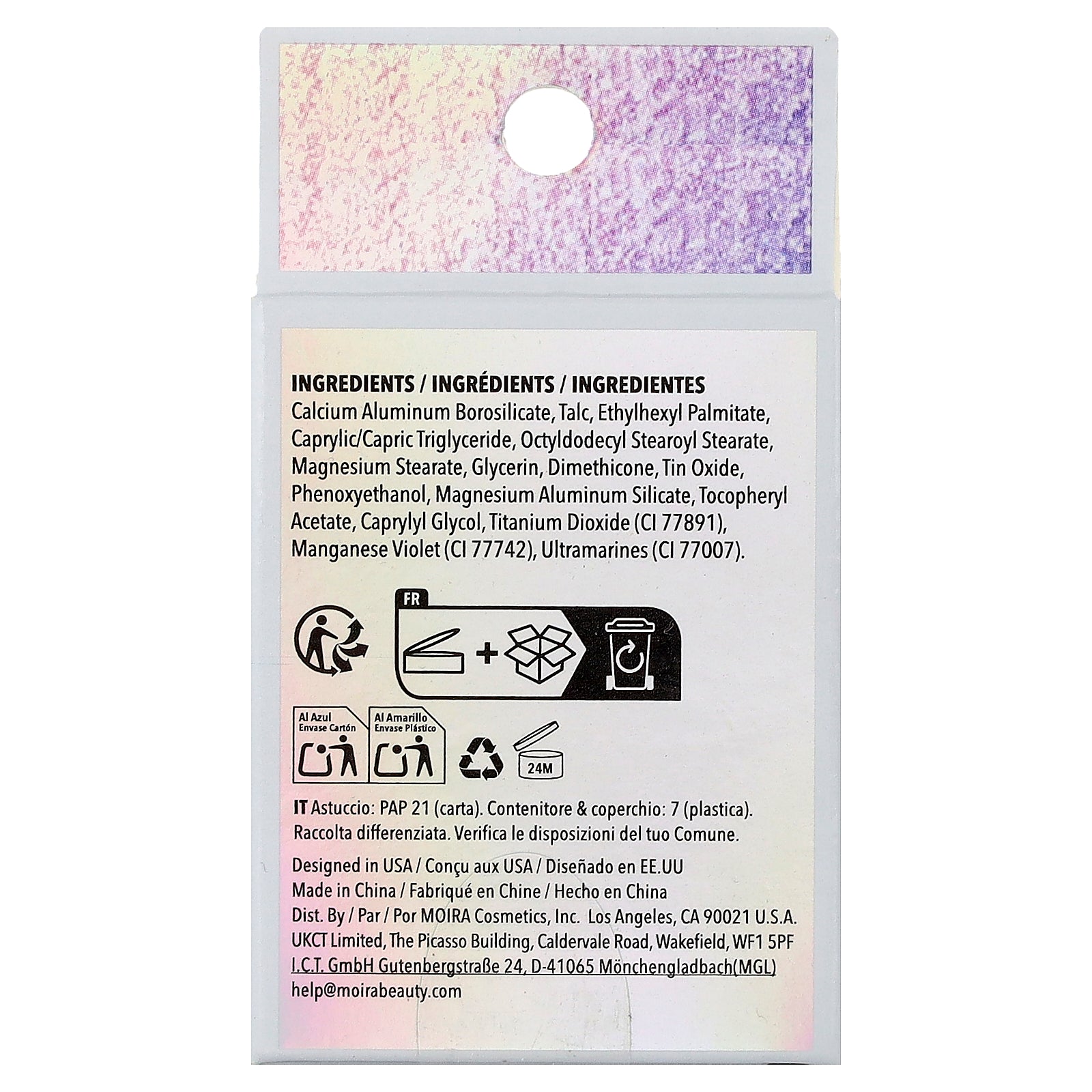 Calcium aluminum borosilicate, talc, ethylhexyl palmitate, caprylic/capric triglyceride, octyldodecyl stearoyl stearate, magnesium stearate, glycerin, dimethicone, tin oxide, phenoxyethanol, magnesium aluminum silicate, tocopheryl acetate, caprylyl glycol, titanium dioxide (ci 77891), manganese violet (ci 77742), ultramarines (ci 77007).