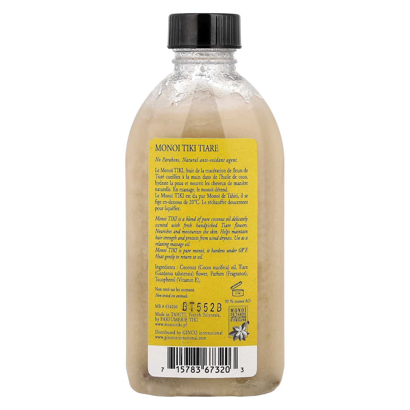 Monoi Tiki is pure monoï, it hardens under 68º F. Heat gently to return to oil.