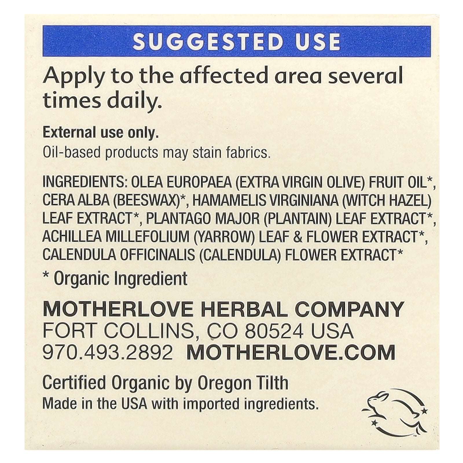 Olea europaea (extra virgin olive) fruit oil* cera alba (beeswax) *, hamamelis virginiana (witch hazel) leaf extract *, plantago major (plantain) leaf extract *, achillea millefolium (yarrow) leaf & flower extract* calendula officinalis (calendula) flower extract*.
