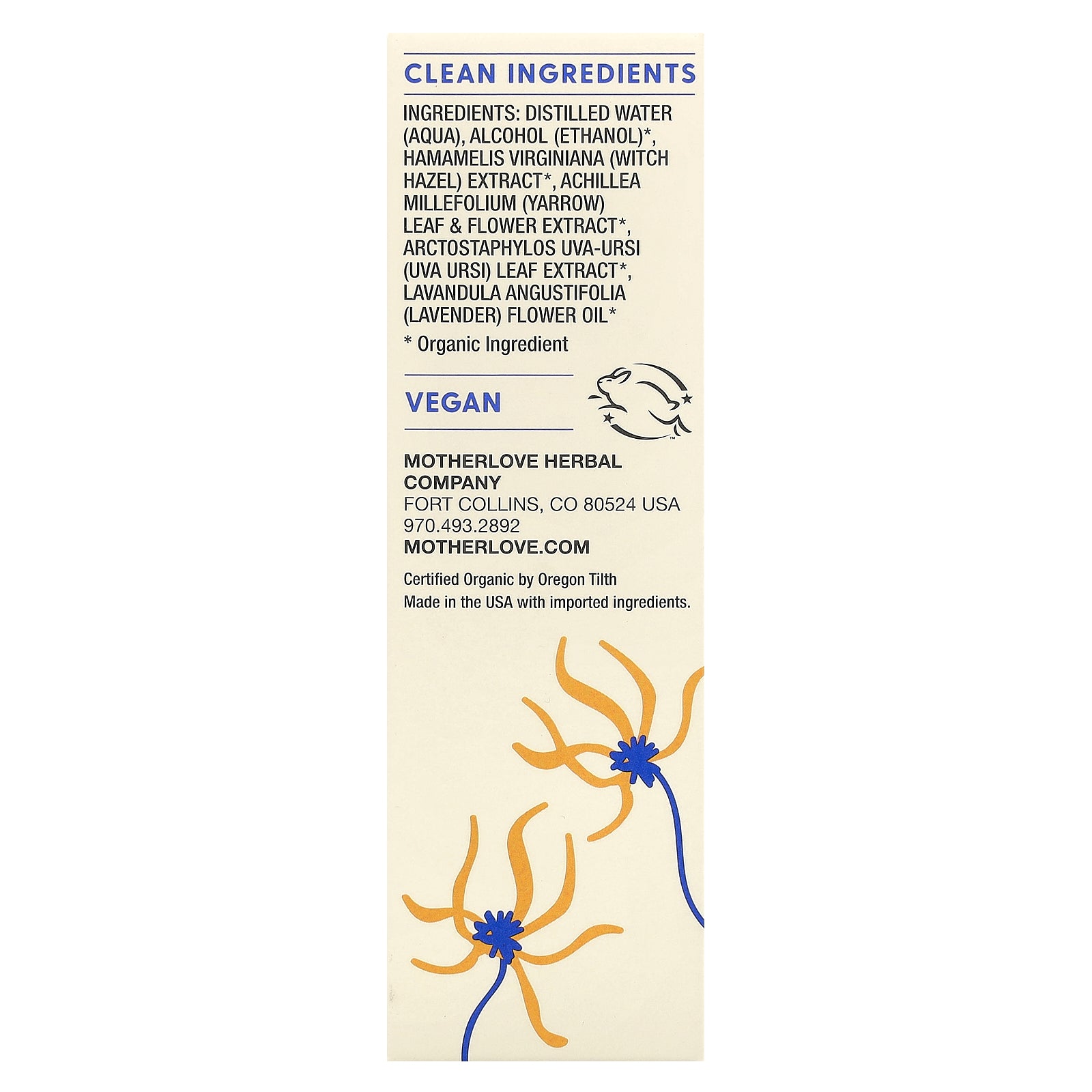 Distilled water (aqua), alcohol (ethanol)*, hamamelis virginiana (witch hazel) extract*, achillea millefolium (yarrow) leaf & flower extract* arctostaphylos uva-ursi (uva ursi) leaf extract*, lavandula angustifolia (lavender) flower oil*.