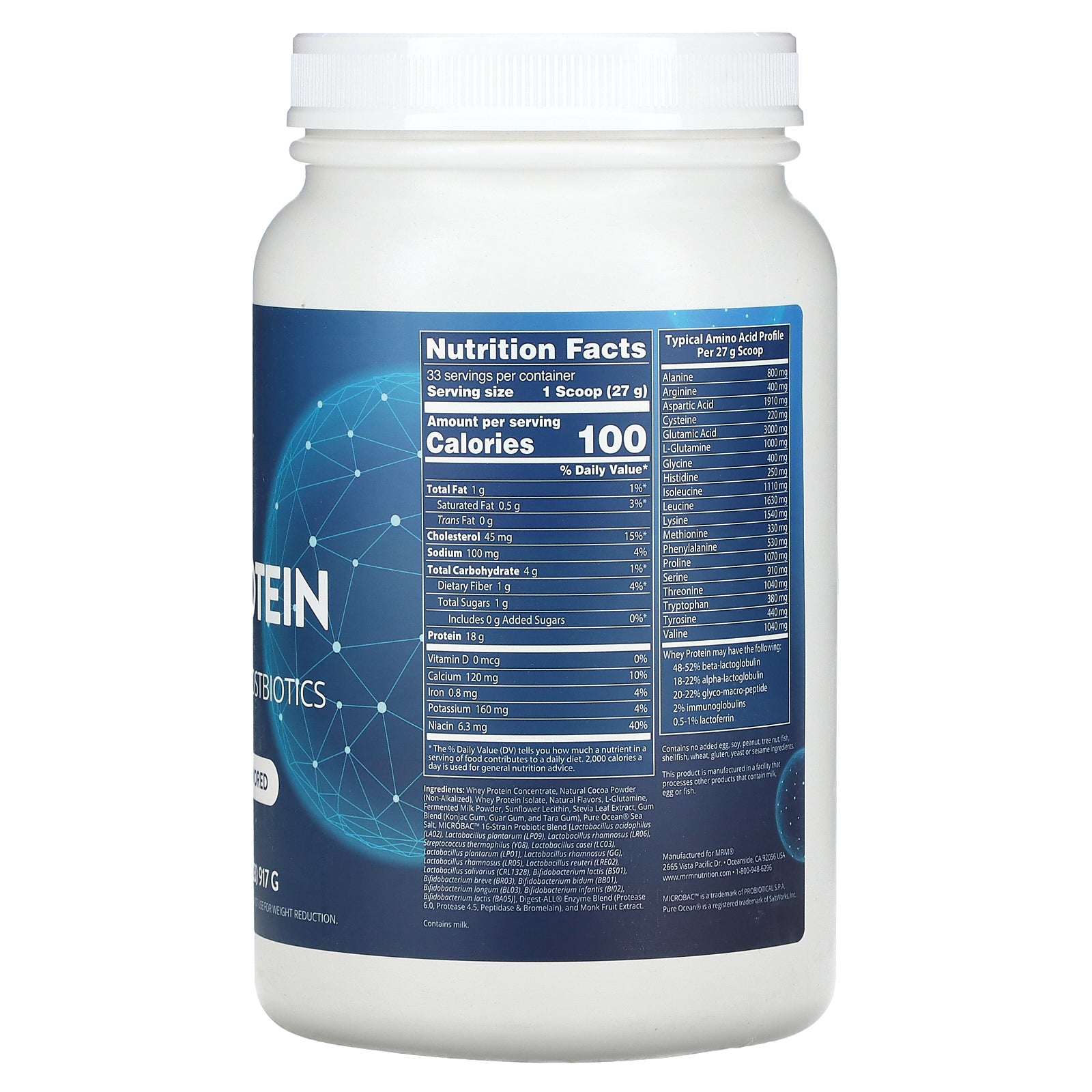 Whey protein concentrate, natural cocoa powder (non-alkalized), whey protein isolate, natural flavors, l-glutamine, fermented milk powder, sunflower lecithin, stevia leaf extract, gum blend (konjac gum, guar gum, and tara gum), pure ocean® sea salt, microbac™ 16-strain probiotic blend [lactobacillus acidophilus (la02), lactobacillus plantarum (lp09), lactobacillus rhamnosus (lr06), streptococcus thermophilus (y08), lactobacillus casei (lc03). lactobacillus plantarum (lp01), lactobacillus rhamnosus (gg). lactobacillus rhamnosus (lr05), lactobacillus reuteri (lre02), lactobacillus salivarius (crl1328), bifidobacterium lactis (bs01), bifidobacterium breve (br03), bifidobacterium bidum (bb01). bifidobacterium longum (bl03), bifidobacterium infantis (bi02), bifidobacterium lactis (ba05)], digest-all@ enzyme blend (protease 6.0, protease 4.5, peptidase & bromelain), and monk fruit extract.
