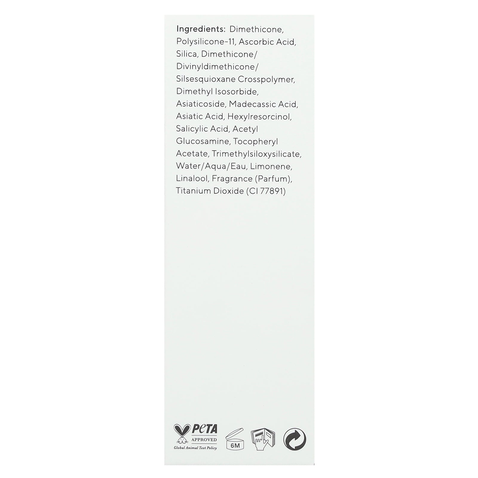 Dimethicone, polysilicone-11, ascorbic acid, silica, dimethicone/ divinyldimethicone/ silsesquioxane crosspolymer, dimethyl isosorbide, asiaticoside, madecassic acid, asiatic acid, hexylresorcinol, salicylic acid, acetyl glucosamine, tocopheryl acetate, trimethylsiloxysilicate, water, limonene, linalool, fragrance (parfum), titanium dioxide (ci 77891).