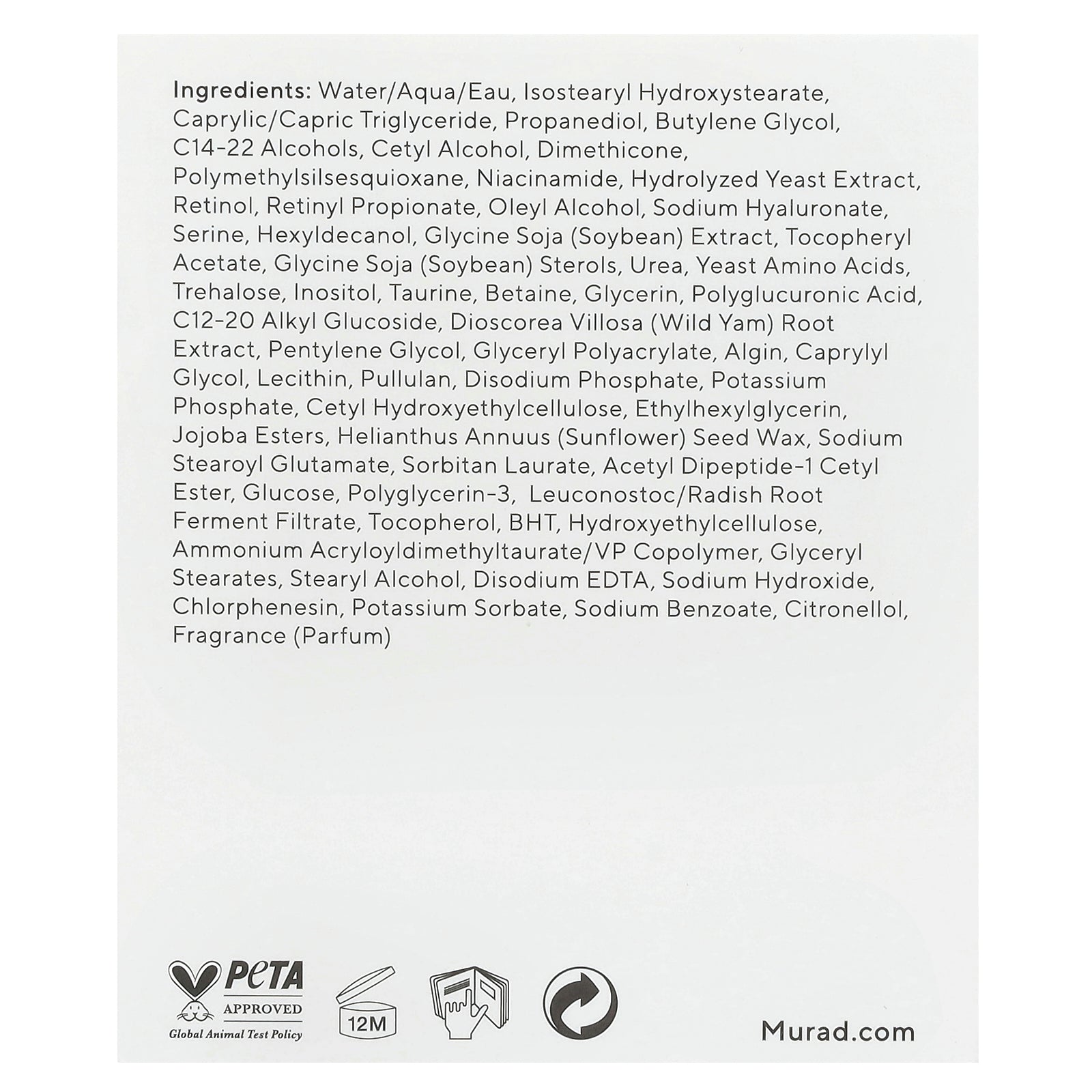 Water, isostearyl hydroxystearate, caprylic/capric triglyceride, propanediol, butylene glycol, c14-22 alcohols, cetyl alcohol, dimethicone, polymethylsilsesquioxane, niacinamide, hydrolyzed yeast extract, retinol, retinyl propionate, oleyl alcohol, sodium hyaluronate, serine, hexyldecanol, glycine soja (soybean) extract, tocopheryl acetate, glycine soja (soybean) sterols, urea, yeast amino acids, trehalose, inositol, taurine, betaine, glycerin, polyglucuronic acid, c12-20 alkyl glucoside, dioscorea villosa (wild yam) root extract, pentylene glycol, glyceryl polyacrylate, algin, caprylyl glycol, lecithin, pullulan, disodium phosphate, potassium phosphate, cetyl hydroxyethylcellulose, ethylhexylglycerin, jojoba esters, helianthus annuus (sunflower) seed wax, sodium stearoyl glutamate, sorbitan laurate, acetyl dipeptide-1 cetyl ester, glucose, polyglycerin-3, leuconostoc/radish root ferment filtrate, tocopherol, bht, hydroxyethylcellulose, ammonium acryloyldimethyltaurate/vp copolymer, glyceryl stearates, stearyl alcohol, disodium edta, sodium hydroxide, chlorphenesin, potassium sorbate, sodium benzoate, citronellol, fragrance (parfum).