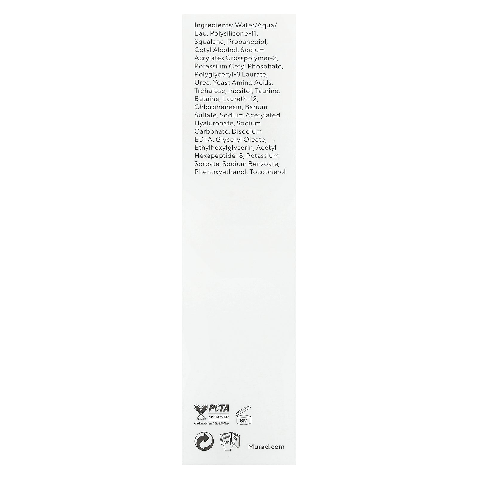 Water/aqua/ eau, polysilicone-11, squalane, propanediol, cetyl alcohol, sodium acrylates crosspolymer-2, potassium cetyl phosphate, polyglyceryl-3 laurate, urea, yeast amino acids, trehalose, inositol, taurine, betaine, laureth-12, chlorphenesin, barium sulfate, sodium acetylated hyaluronate, sodium carbonate, disodium edta, glyceryl oleate, ethylhexylglycerin, acetyl hexapeptide-8, potassium sorbate, sodium benzoate, phenoxyethanol, tocopherol.