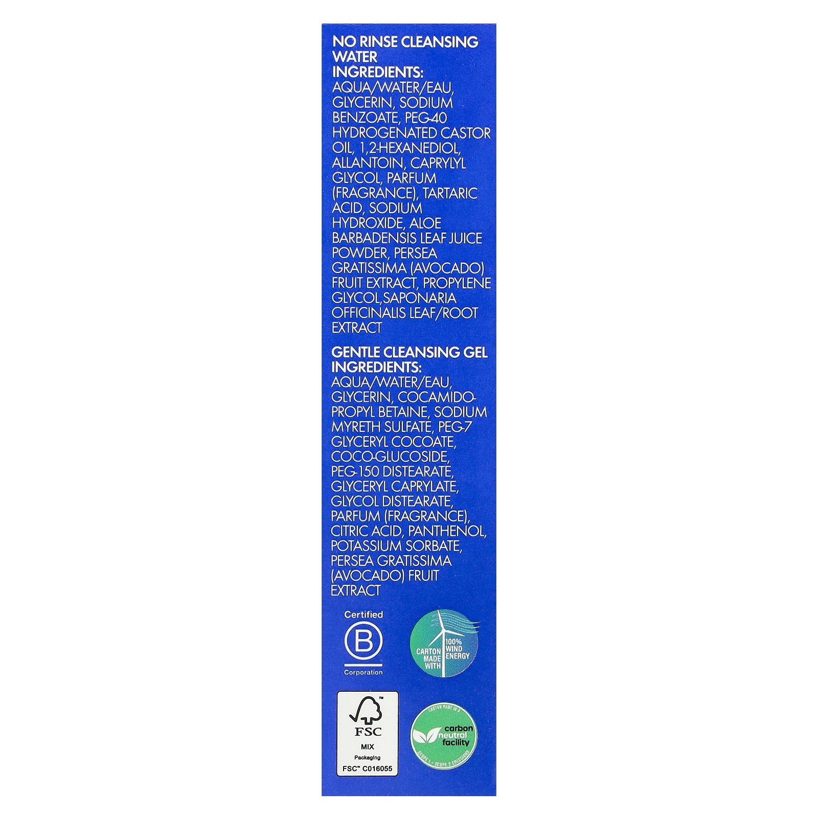 No Rinse Cleansing Water: Water, glycerin, sodium benzoate, peg-40 hydrogenated castor oil, 1,2-hexanediol, allantoin, caprylyl glycol, parfum (fragrance), tartaric acid, sodium hydroxide, aloe barbadensis leaf juice powder, persea gratissima (avocado) fruit extract, propylene glycol,saponaria officinalis leaf/root extract.