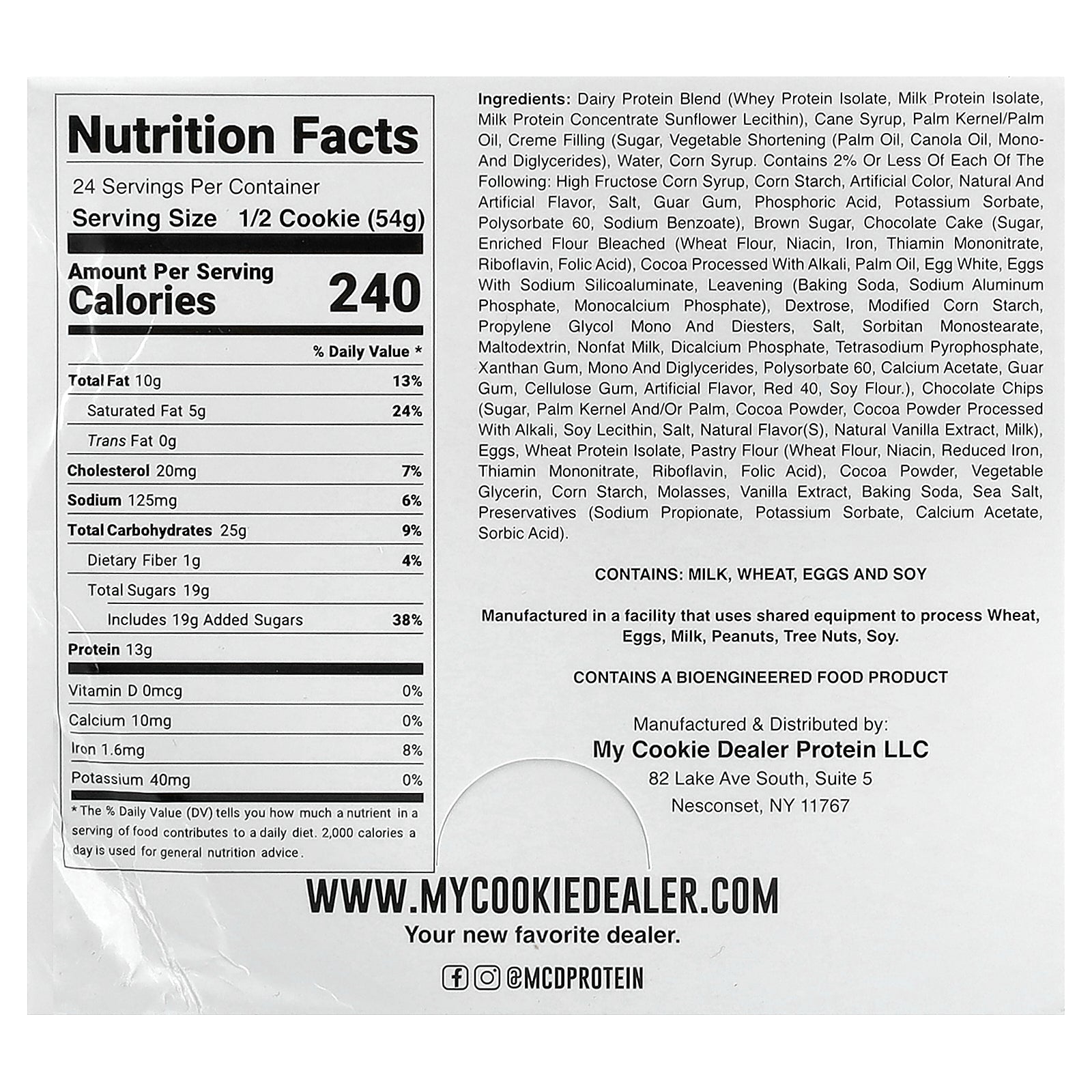 Dairy protein blend (whey protein isolate, milk protein isolate, milk protein concentrate, sunflower lecithin), cane syrup, palm kernel/palm oil, creme filling (sugar, vegetable shortening (palm oil, canola oil, mono- and diglycerides), water, corn syrup. Contains 2% or less of each of the following: high fructose corn syrup, corn starch, artificial color, natural and artificial flavor, salt, guar gum, phosphoric acid, potassium sorbate, polysorbate 60, sodium benzoate), brown sugar, chocolate cake (sugar, enriched flour bleached (wheat flour, niacin, iron, thiamin mononitrate, riboflavin, folic acid), cocoa processed with alkali, palm oil, egg white, eggs with sodium silicoaluminate, leavening (baking soda, sodium aluminum phosphate, monocalcium phosphate), dextrose, modified corn starch, propylene glycol mono and diesters, salt, sorbitan monostearate, maltodextrin, nonfat milk, dicalcium phosphate, tetrasodium pyrophosphate, xanthan gum, mono and diglycerides, polysorbate 60, calcium acetate, guar gum, cellulose gum, artificial flavor, red 40, soy flour), chocolate chips (sugar, palm kernel and/or palm, cocoa powder, cocoa powder processed with alkali, soy lecithin, salt, natural flavor(s), natural vanilla extract, milk), eggs, wheat protein isolate, pastry flour (wheat flour, niacin, reduced iron, thiamin mononitrate, riboflavin, folic acid), cocoa powder, vegetable glycerin, corn starch, molasses, vanilla extract, baking soda, sea salt, preservatives (sodium propionate, potassium sorbate, calcium acetate, sorbic acid).