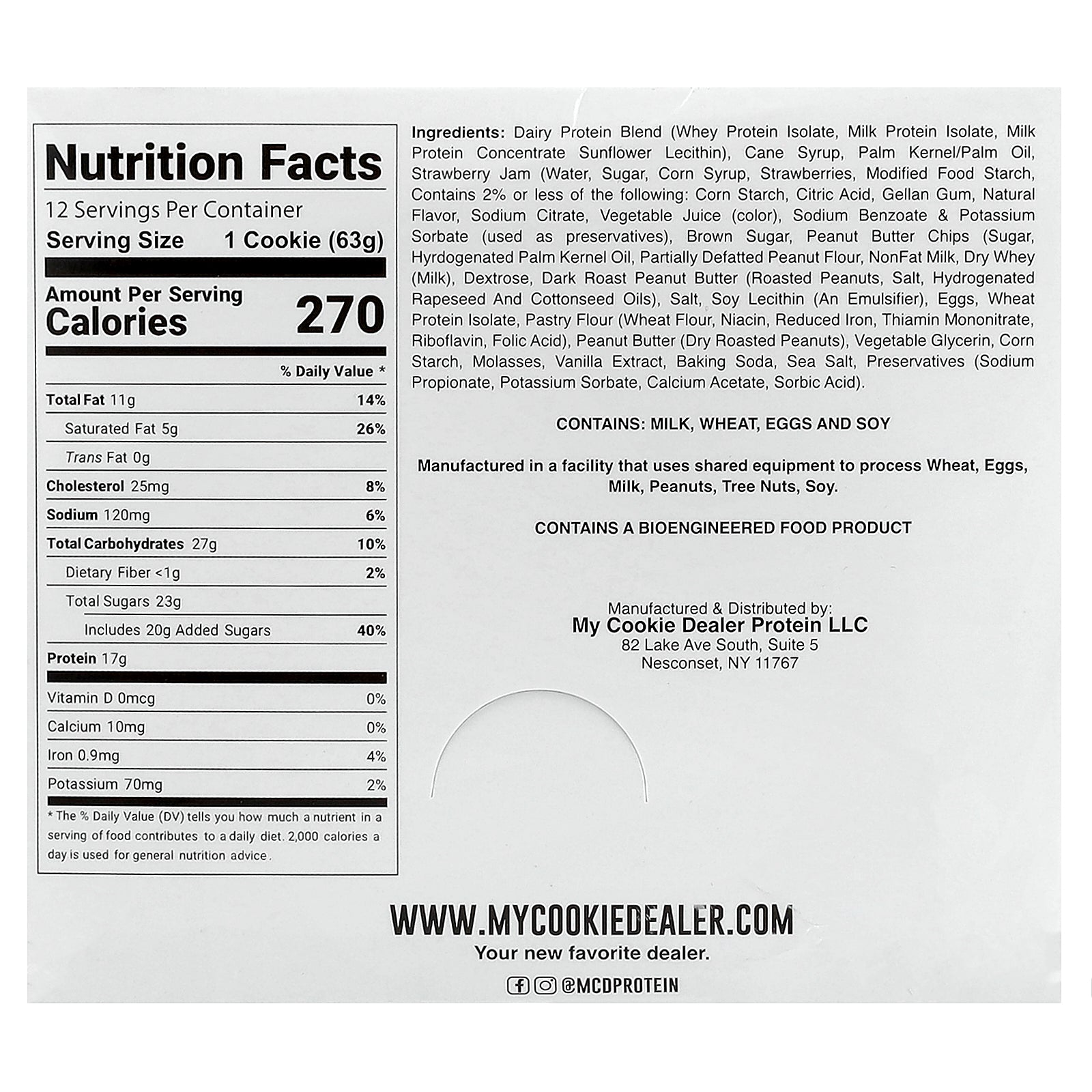 Dairy protein blend (whey protein isolate, milk protein isolate, milk protein concentrate, sunflower lecithin), cane syrup, palm kernel/palm oil, strawberry jam (water, sugar, corn syrup, strawberries, modified food starch, contains 2% or less of the following: corn starch, citric acid, gellan gum, natural flavor, sodium citrate, vegetable juice (color), sodium benzoate & potassium sorbate (used as preservatives)), brown sugar, peanut butter chips (sugar, hydrogenated palm kernel oil, partially defatted peanut flour, nonfat milk, dry whey (milk), dextrose, dark roast peanut butter (roasted peanuts, salt, hydrogenated rapeseed and cottonseed oils), salt, soy lecithin (an emulsifier), eggs, wheat protein isolate, pastry flour (wheat flour, niacin, reduced iron, thiamin mononitrate, riboflavin, folic acid), peanut butter (dry roasted peanuts), vegetable glycerin, corn starch, molasses, vanilla extract, baking soda, sea salt, preservatives (sodium propionate, potassium sorbate, calcium acetate, sorbic acid).