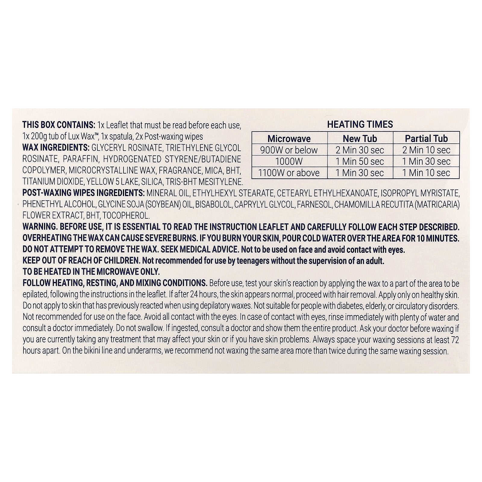 Before use, it is essential to read the instruction leaflet and carefully follow each step described. Overheating the wax can cause severe burns. If you burn your skin, pour cold water over the area for 10 minutes. Do not attempt to remove the wax. Seek medical advice. Not to be used on face and avoid contact with eyes.